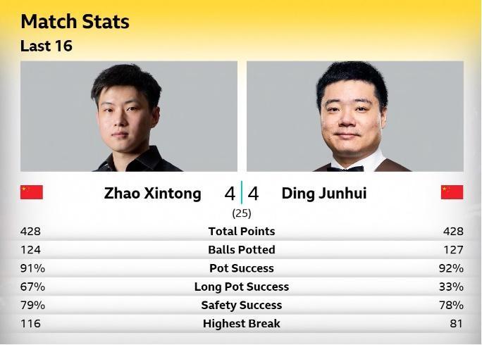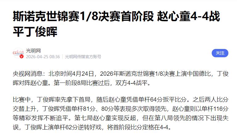 斯诺克中国德比打平了!丁俊晖赵心童首阶段4-4,第八局逆转太揪心 北京时间4月24日,2026年斯诺克世锦赛1/8决赛,俩中国顶尖选手丁俊晖和赵心童对上了,这就是大家说的中国德比。 39岁的丁俊晖是老将,29岁的赵心童是上届冠军,俩人打了8局,最后4-4平,谁也没占到便宜,悬念全留到后面了。 跟大家说一声,俩人第二阶段比赛,定在北京时间4月25日21:30,喜欢看斯诺克的可别错过。 斯诺克世锦赛就是斯诺克界最厉害的比赛,能闯进1/8决赛的,都是世界上最顶尖的选手。俩中国人在这种大赛上碰面,就是中国德比,不管谁赢,都是咱们中国斯诺克的荣耀。 这8局比赛没一边倒,全程都咬得很紧,每一局都打得特别认真,尤其是最后一局的逆转,看得人心里直打鼓。 咱们先说说这8局的情况,不搞复杂的,一听就懂。比赛一开始,丁俊晖先进入状态,稳稳拿下第一局,给赵心童一个措手不及。 但赵心童也不弱,很快就调整过来,单杆打了64分,把比分扳平,俩人又站到同一起跑线。 接下来就有意思了,你赢一局我追一局,丁俊晖单杆打了81分、80分,好几次都领先;赵心童也不甘示弱,单杆打了116分的高分,一次次追平,场面特别热闹。 打到第七局,赵心童抓住机会,反超丁俊晖,4-3领先,眼看就要在这一阶段占上风。 可谁也没想到,第八局出了意外:赵心童一开始打得很顺,领先不少,本来稳赢的局,偏偏出现失误,给了丁俊晖机会。丁俊晖没浪费机会,单杆打了62分,逆转拿下这一局,最后俩人4-4打平。 俩人打平不是运气,跟他们的状态、打法还有心态都有关系,丁俊晖是老将,已经连续20次参加世锦赛,经验特别足,做事稳,不慌不忙。 他赛前闭关练了两个月,状态越来越好,首轮10-5轻松赢了对手,进攻和安全球都打得好,防守也细腻。 但他年纪大了,长台打得不准,只有33%,比赵心童差不少,好几次因为长台没打好,没把握住扩大比分的机会,而且他出杆慢,打久了费体力,后面容易被牵制。 再看赵心童,他是上届冠军,现在正是打球的最好时候,年轻有劲儿,打法特别猛,主打进攻,出杆又快又果断,比丁俊晖快很多。 他长台打得准,这次达到了67%,单杆116分就看出他的进攻实力了,而且最近状态特别好,这赛季拿了好几个冠军,进攻火力特别足。 但他的毛病也很明显,心态太急,关键时候沉不住气,就像第八局,本来能赢,一着急失误了,硬生生把赢局送出去了,而且他防守细节做得不好,经常给对手留机会,开局也容易慢热。 另外跟大家说下,世锦赛1/8决赛是25局13胜,分三个阶段打,这8局只是第一阶段,相当于热身,真正的较量还在后面。 这种长局制特别考验体力和心态,不是靠一时手感就能赢的。对丁俊晖来说,长局制更有利,他稳的打法适配这种慢节奏,经验也足;对赵心童来说,年轻有体力、进攻猛是优势,但心态急、防守差,可能会影响后面的发挥。 俩人之前交手6次,丁俊晖赢了4次,但最近两次都是赵心童赢,看得出来赵心童越来越厉害,现在俩人实力差不多。 接下来的第二阶段,两人肯定都会调整打法,丁俊晖大概率还是稳着来,拖慢节奏;赵心童应该会继续猛进攻,尽量少失误。 4月25日21:30,咱们看看谁能占上风,不管谁赢,都是咱们中国选手的骄傲,大家记得锁定观看,为他俩加油。