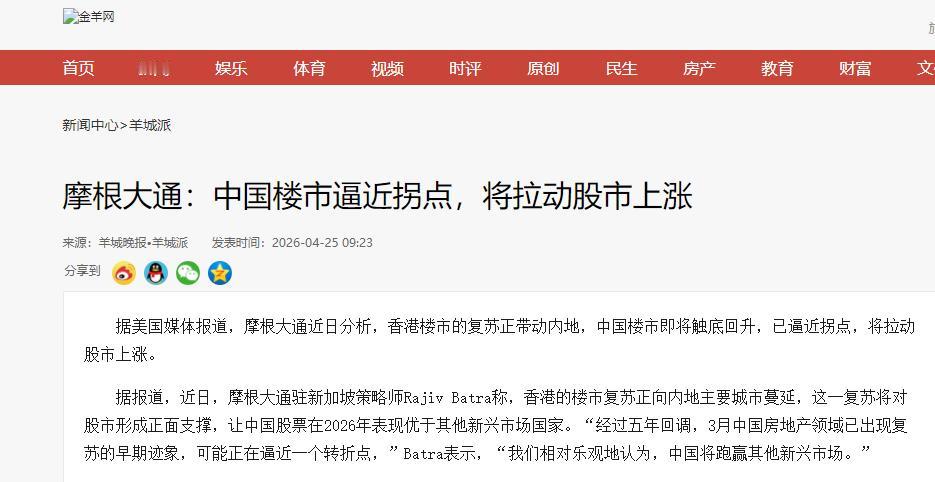 楼市、股市,有大消息了! 4月25日美国媒体报道,国际大投行摩根大通说,中国楼市快触底了,马上要回升,还能拉动股市涨,2026年中国股票能比其他发展中国家的好。 这话不是瞎忽悠,摩根大通的专家明确说,香港楼市已经先热起来了,热度正传到内地,今年3月楼市就有复苏迹象,拐点快到了。 而且咱们内地一线城市的二手房,3月份卖得特别火,4月还在涨,房企销售也在好转。 先跟大家说,摩根大通可不是随便说话的,它是国际上顶尖的投行,分析市场特别严谨,这次敢说楼市要触底,就靠两个实打实的依据。 一是香港楼市真的复苏了,别觉得香港和咱们没关系,它的楼市动静,会影响咱们的信心,资金也能联动。 今年一季度香港楼市卖得特别好,房价、租金都在涨,还有人一次性买好几套,说明不是短期炒作,是真回暖。 香港的热度,很快就传到了咱们内地一线城市。一线城市就是楼市的“晴雨表”,它先暖,其他城市慢慢也会跟上。今年3月,北京、上海、广州、深圳的二手房,卖得那叫一个火。 北京卖了快2万套,创15个月新高;广州、深圳比2月多卖了一倍多;上海卖了3万多套,近5年最高,4月还在同比上涨,这不是偶然,是真的在回暖。 不光是二手房,头部房企的情况也在好转。前两年房企日子不好过,大家买房怕烂尾,不敢下手。 但今年一季度,重点房企的销售虽然还比去年少,但下跌的速度慢了,这就说明房企在好转,资金压力小了,“保交楼”也更有保障,咱们买房也更放心,形成好循环。 大家最关心的,楼市回暖为啥能带动股市涨?其实很简单,不用讲复杂道理。第一,房地产牵扯的行业多,水泥、钢铁、家电、装修,都靠楼市吃饭,楼市好了,这些行业生意就好,它们的股票自然容易涨,比如买了房要换家电,家电公司赚钱了,股票就可能涨。 第二,楼市好了,大家心里有底了,觉得资产不会贬值,就敢把钱拿出来投资,一部分钱进股市,股市资金多了,就容易涨。 而且国家也在帮楼市,出台了退税、降首付的政策,就是为了让楼市稳起来,楼市稳了,经济就稳,股市也会受益。 最后必须提醒大家,别以为“拐点”就是房价暴涨、股市立刻涨,千万别跟风。摩根大通只说“逼近拐点”,还是慢慢回升的阶段,今年二季度才是确认底部的关键期。 攒点钱不容易,买房、买股票都要量力而行,别听风就是雨。而且不是所有城市都能涨,一线城市和强二线能回暖,三四线还是比较难;股市也不是所有股票都涨,主要是和房地产相关的股票。 有买房需求的,趁现在政策好可以多看看;买股票的,多关注相关板块,稳着来。咱们求稳最重要,辛辛苦苦攒的钱,平平安安才是真的好。