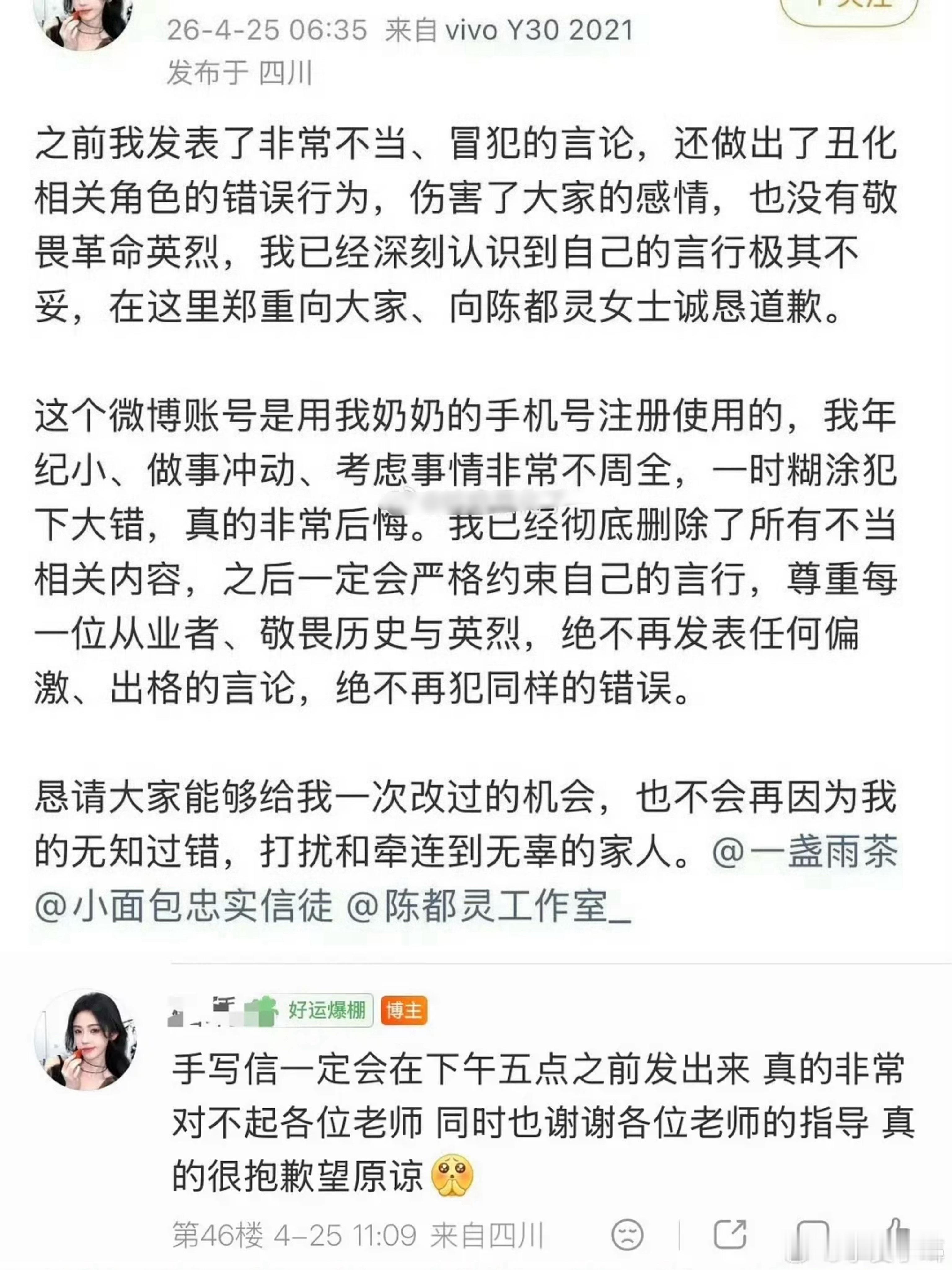 陈都灵黑粉手写道歉信