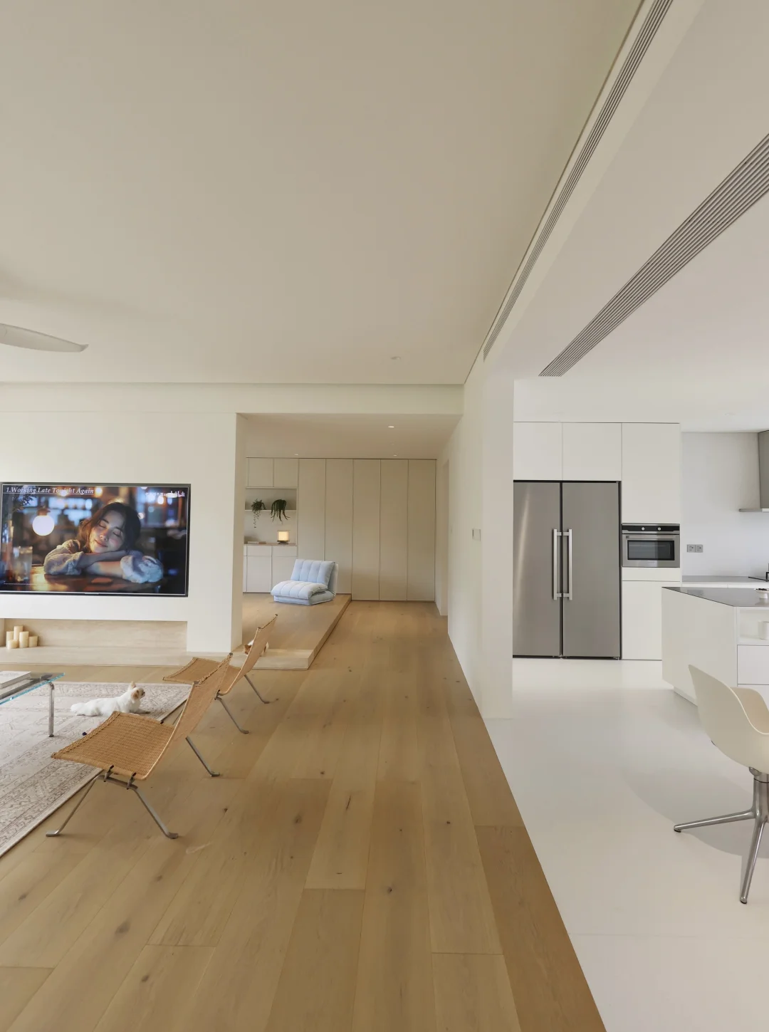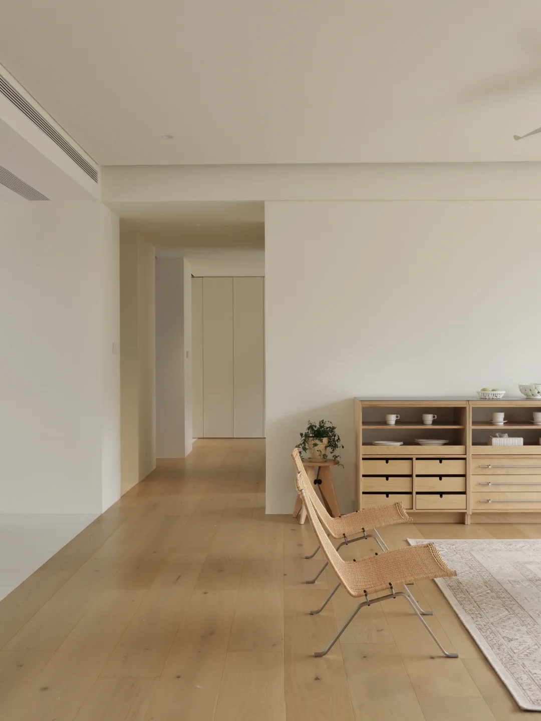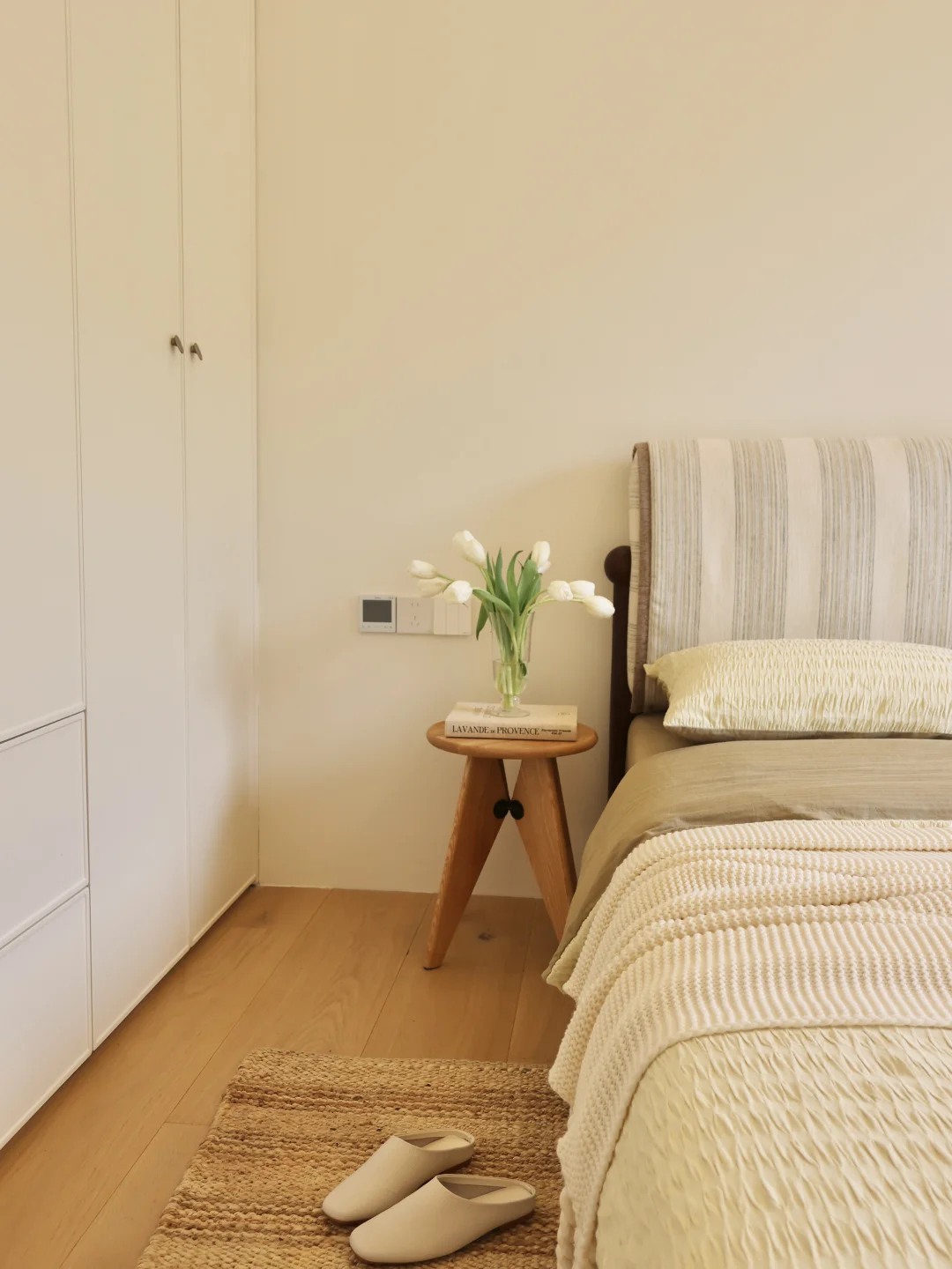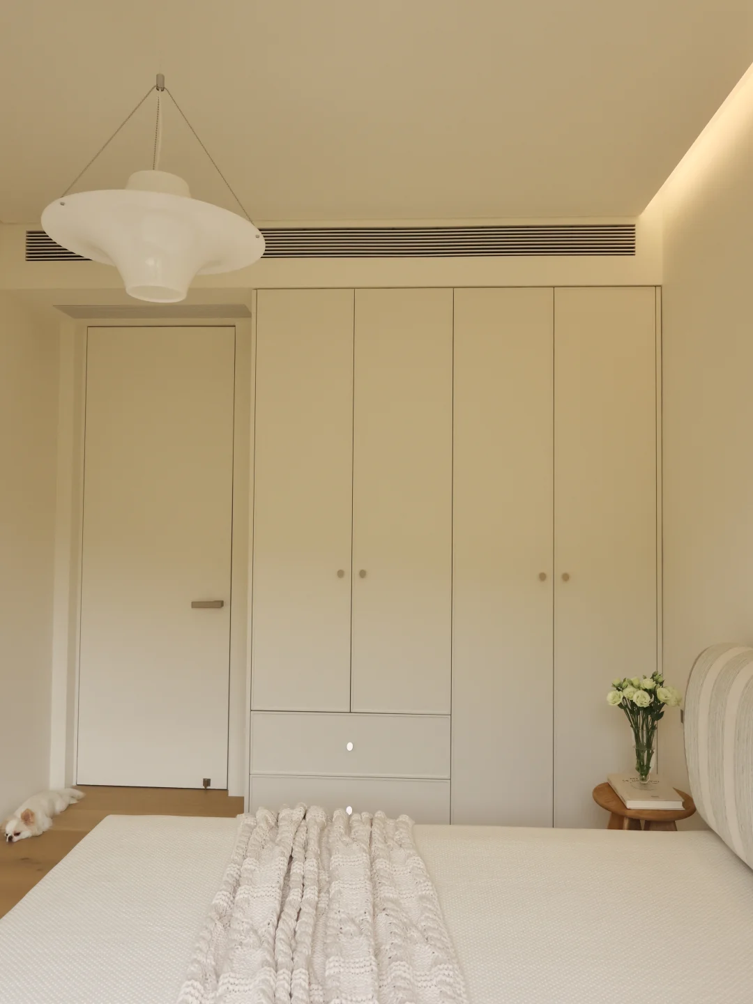 家里这个小房间没有做复杂的设计,定制了一排通顶衣柜,收纳力拉满,杂物全藏起来,留白的空间更显干净通透。