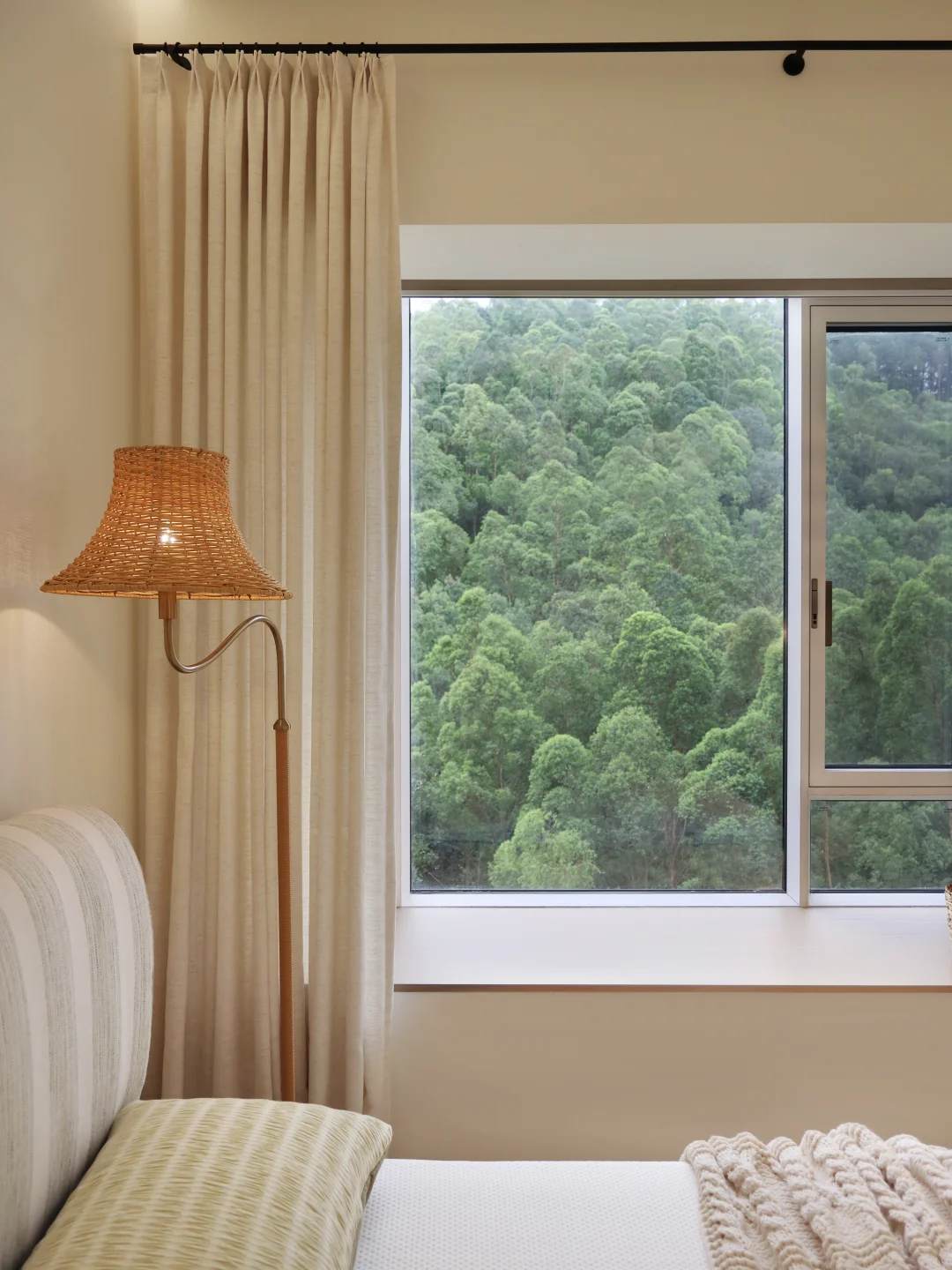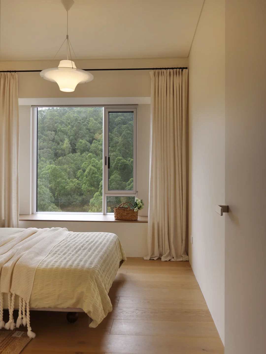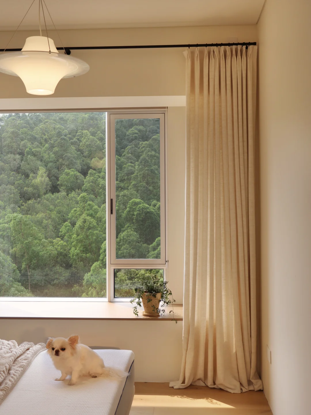 一整面落地窗将窗外的树景框进家里,松弛感满满