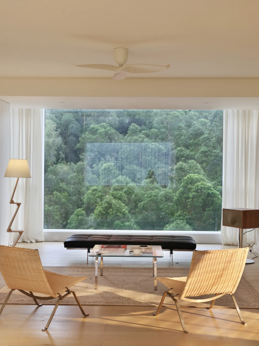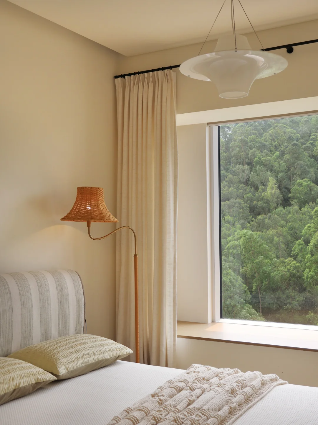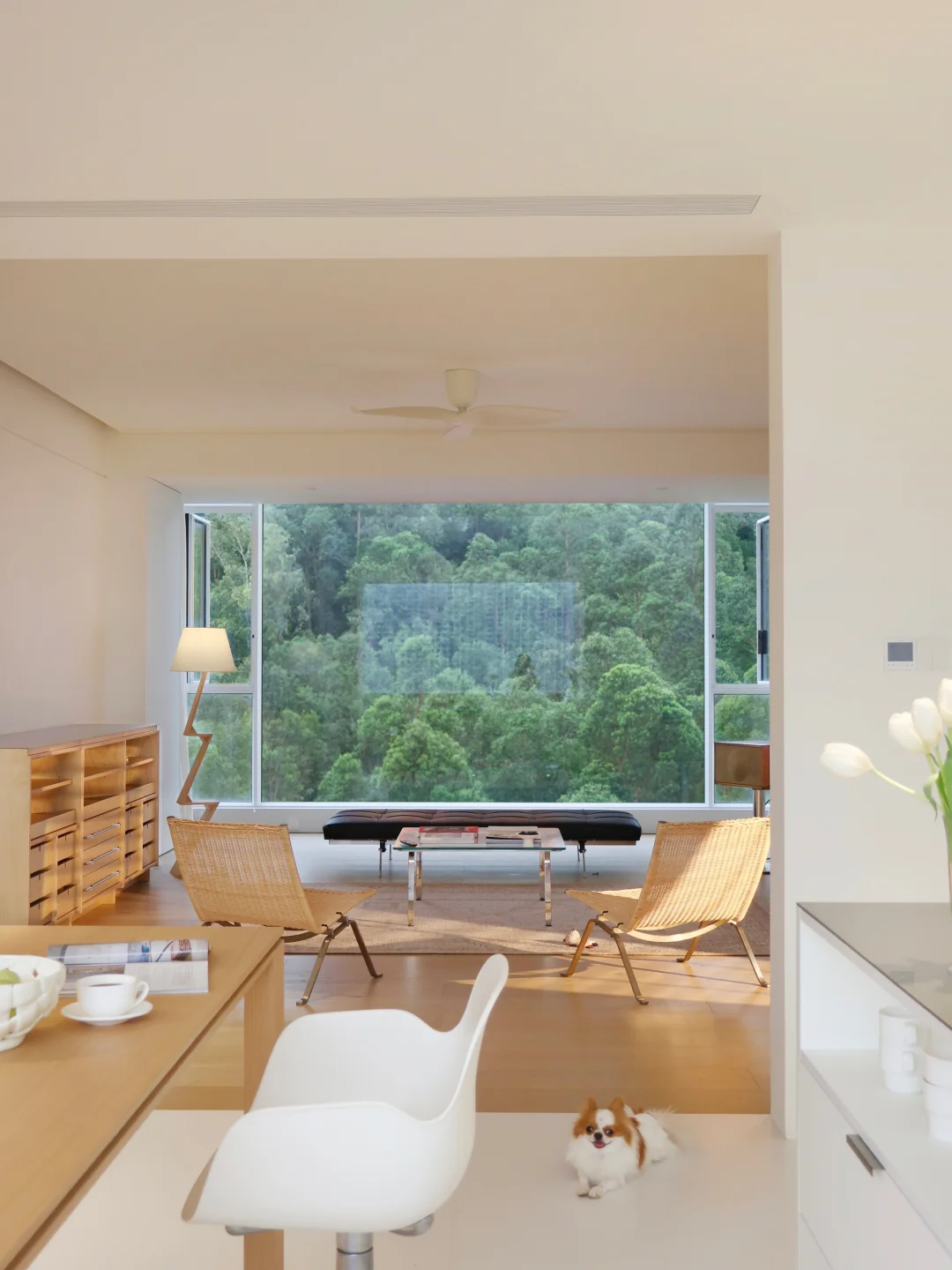一整面落地窗将窗外的树景框进家里,松弛感满满