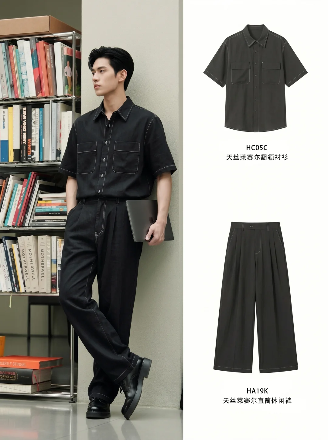 视觉上的“呼吸感”: 很多黑色衣服穿上会显得沉闷,但这件天丝莱赛尔衬衫带有一种柔和的缎面光泽。丝滑质感,那种明暗交织的纹理,真的很显贵