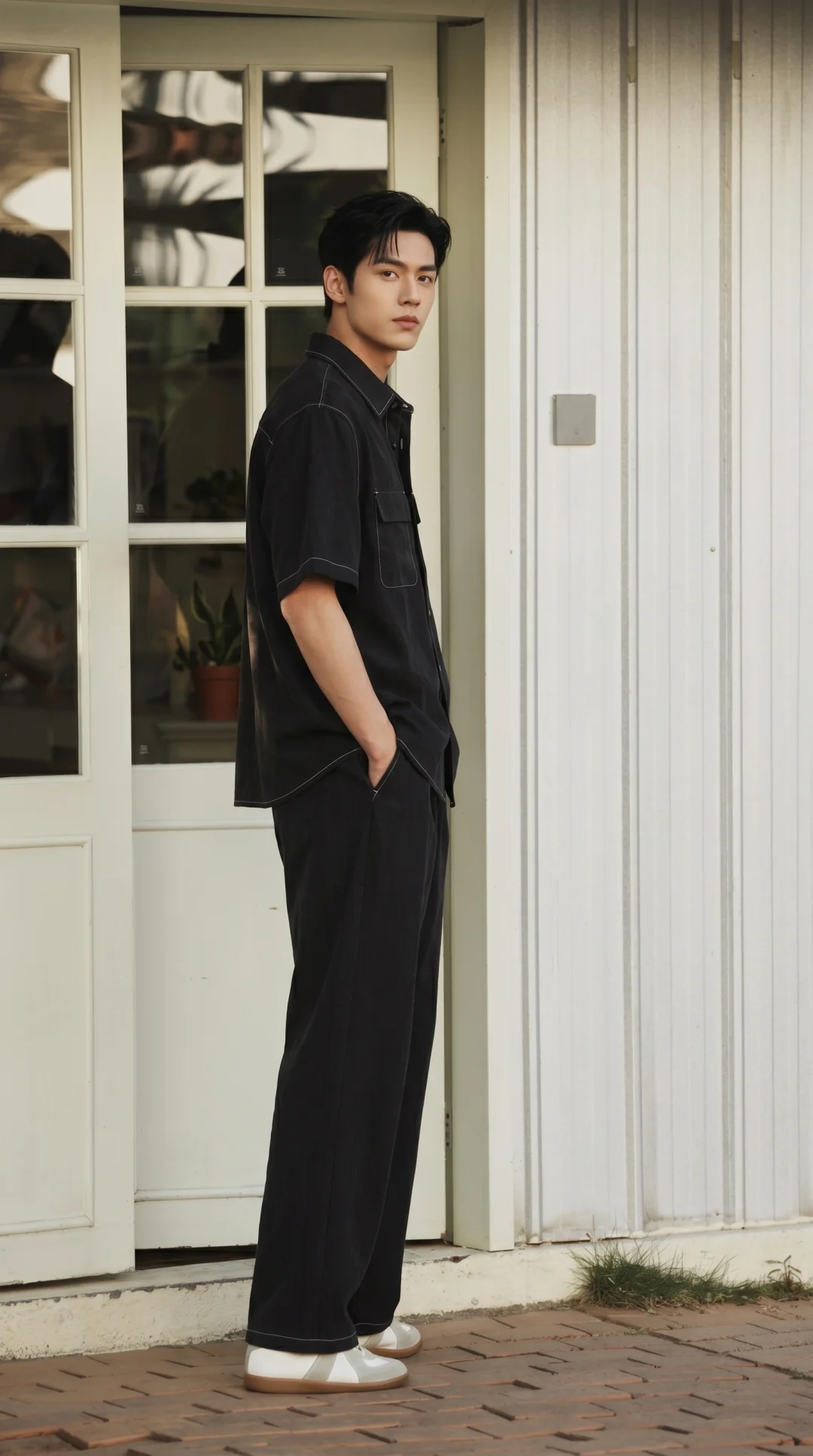 廓形里的“微操”: 下半身的直筒休闲裤 做了微阔设计,天丝的垂坠感顺着腿线直降,完全不贴腿。哪怕是170cm的身高,在视觉上也被拉成了180cm的长腿既视感