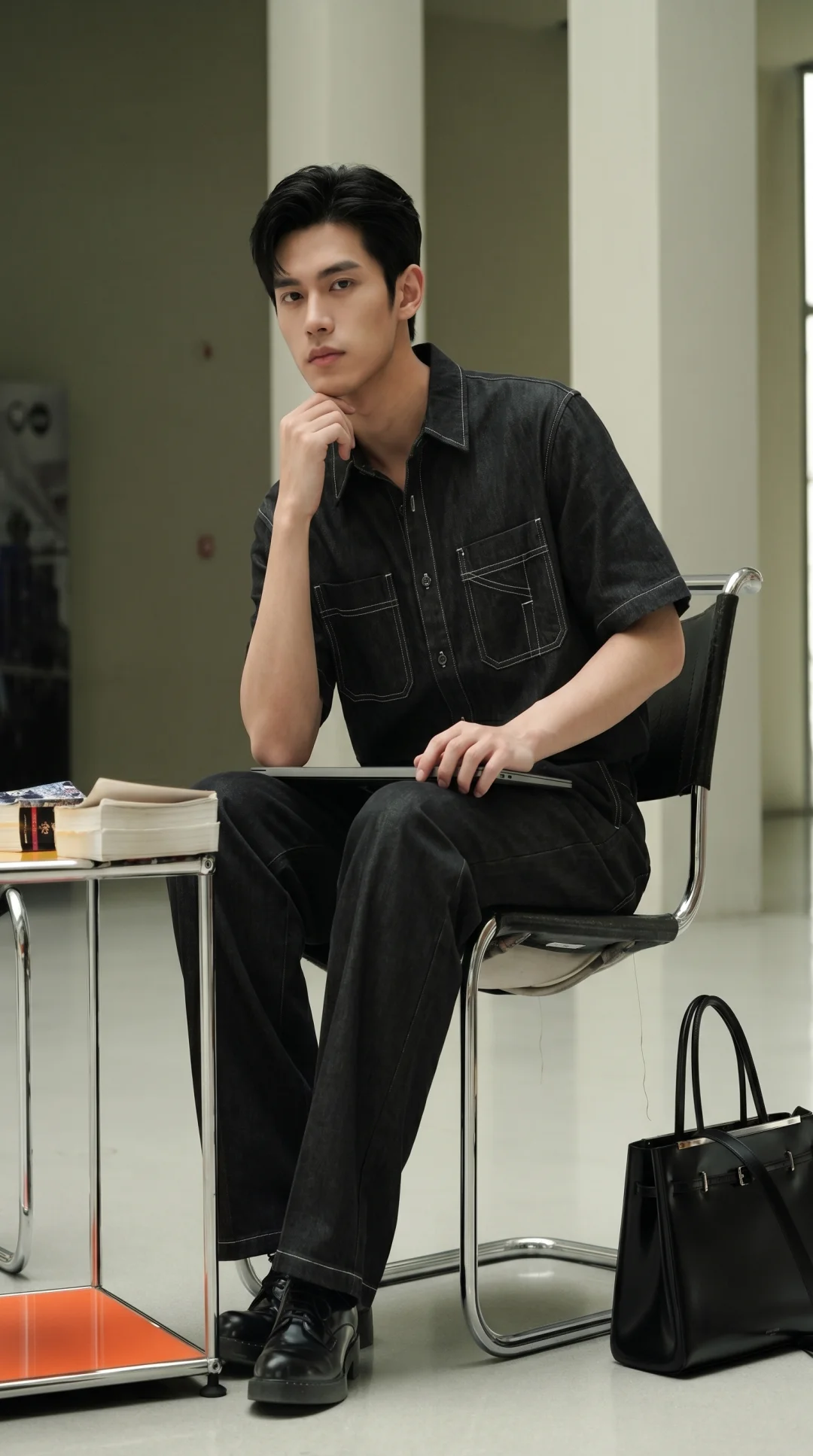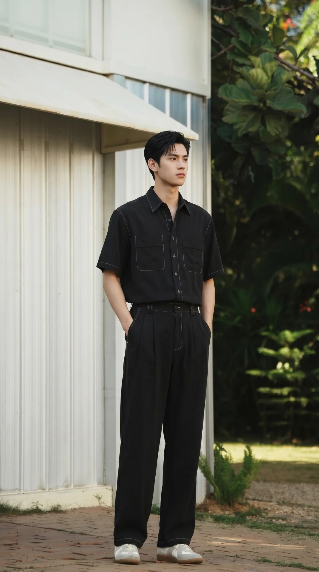 白明线的“克制美”: 整套衣服用了精致的针线工艺,这一圈白明线简直是点睛之笔。它打破了纯黑的单调,让整个人看起来不仅稳重,还带点“雅痞”的精致