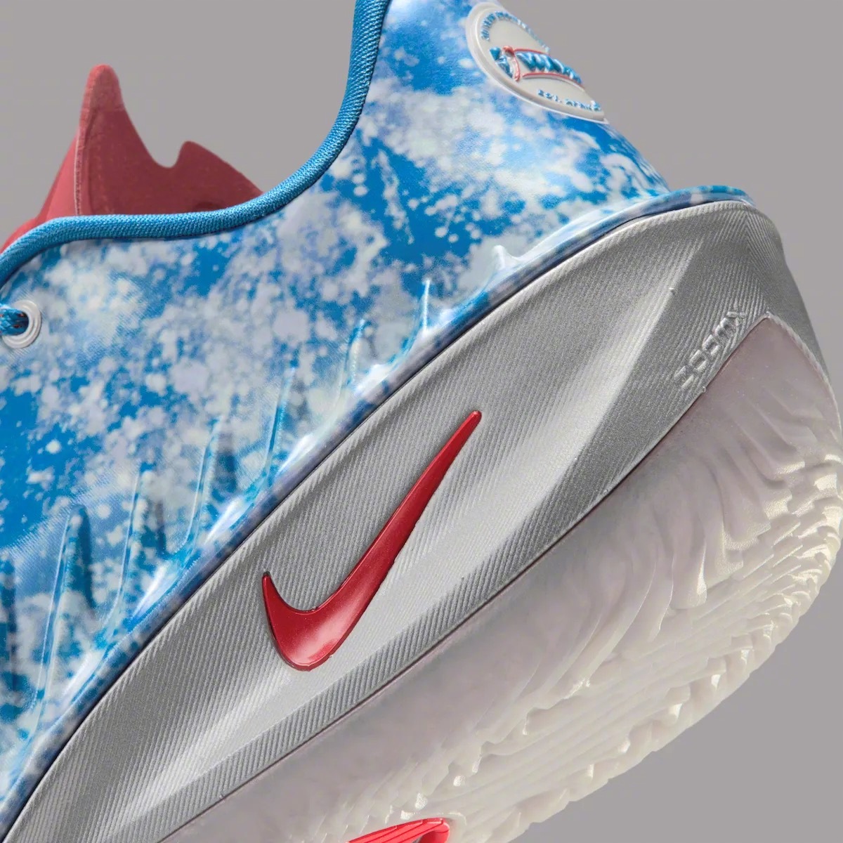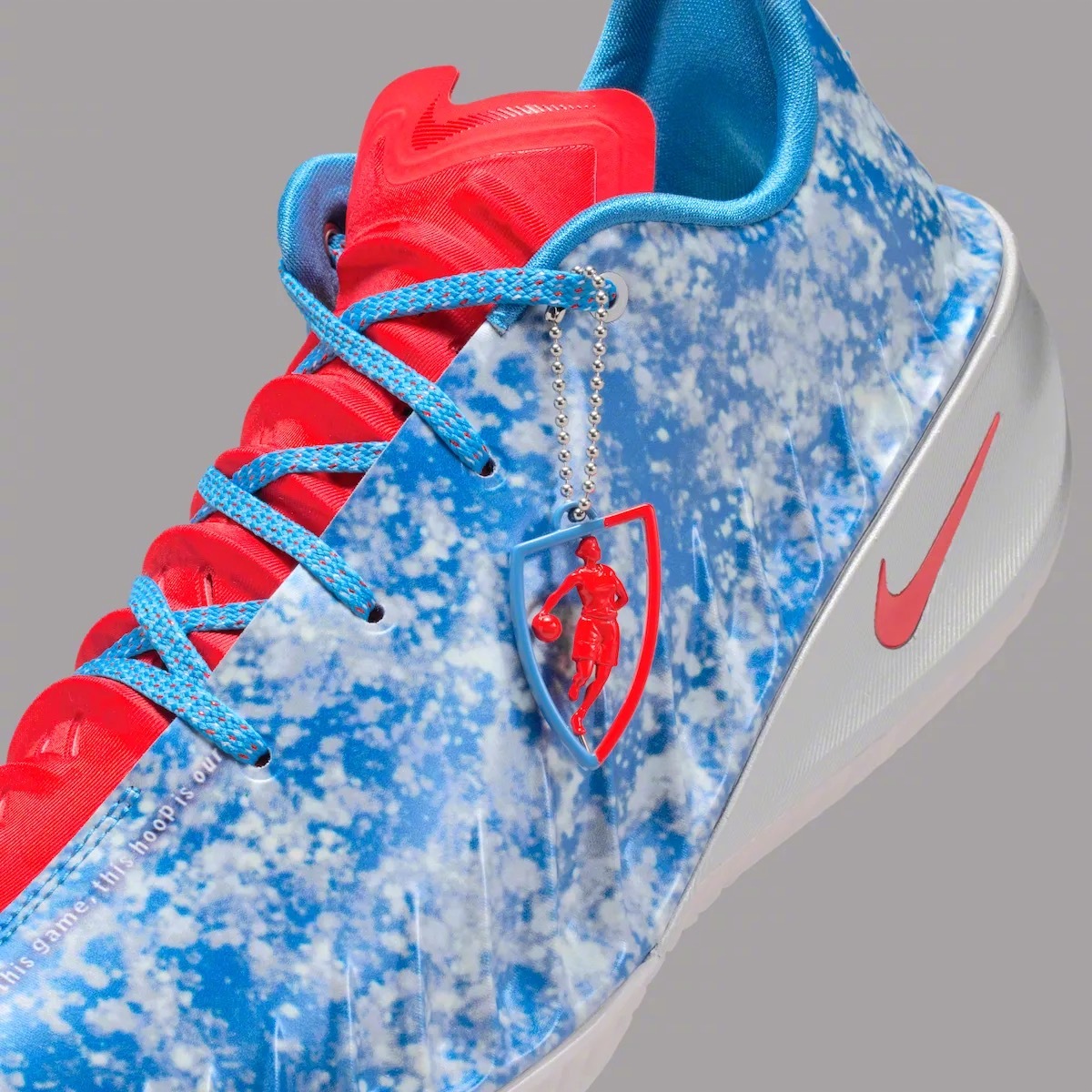 GT Cut 4「WNBA 30周年」纪念版官图,采用了内侧红外侧蓝白天空图案的设计,金属银中底,后跟圆形徽章印着WNBA原始LOGO和「30 Year Anniversary」以及联盟成立日期「1996年4月24日」,并带有WNBA LOGO吊坠。🏀