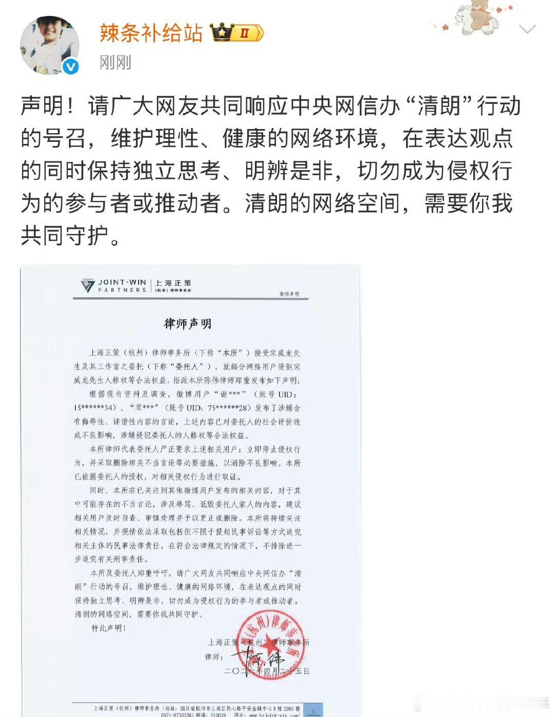 宋威龙工作室律师声明一张图引起的风波。宋威龙工作室发声明了,闹这么大!大家都冷静,都是为了自担好!宋威龙工作室律师声明