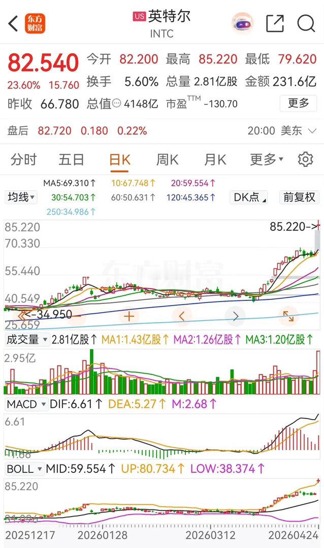 个股层面更是热度拉满:英特尔跳空高开,单日大涨23.60%;英伟达同步高开高走,市值重回5.06万亿美元上方,股价报208.27美元,科技龙头强势爆发,市场做多情绪持续升温。