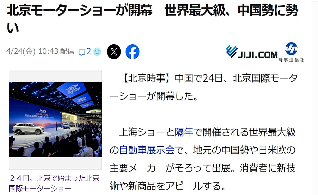 全球主流厂牌齐聚,技术与新车扎堆上新。 日媒盯紧了。 《时事通信社》点名:丰田、本田、日产悉数到场,燃油车还有硬功夫,却在中国市场鏖战吃力。 另一边,比亚迪、华为搭起大展台,本土销量猛冲,海外车型加码,版图往外铺。