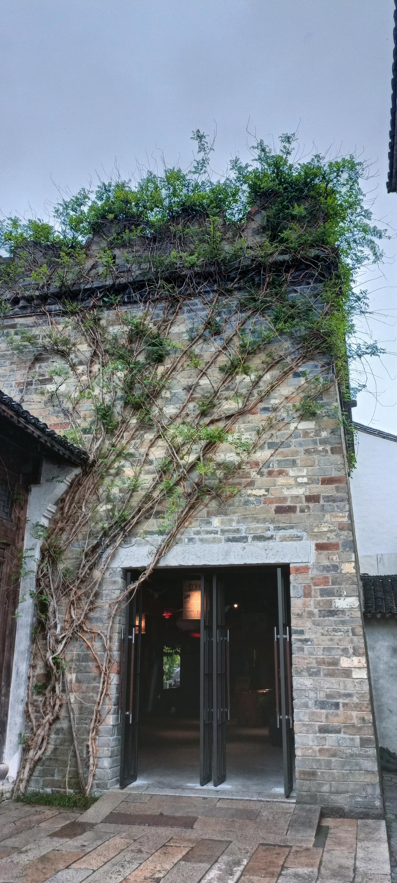古朴砖墙,绿植缠绕,静谧的庭院入口,仿佛穿越时光的隧道。 上联:藤掩映古墙, 下联:静待古人归。