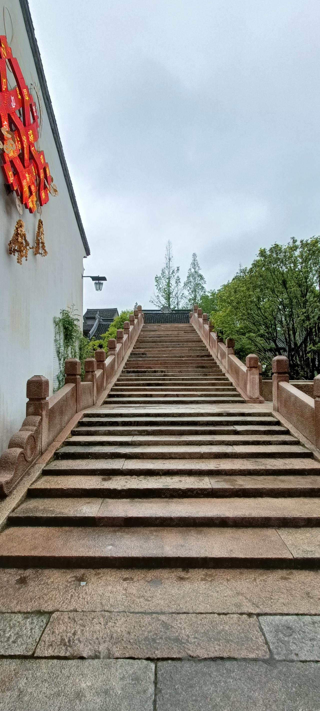 古风石阶,红灯笼映衬,静谧而庄严。 上联:灯笼映古道, 下联:石阶通天际。