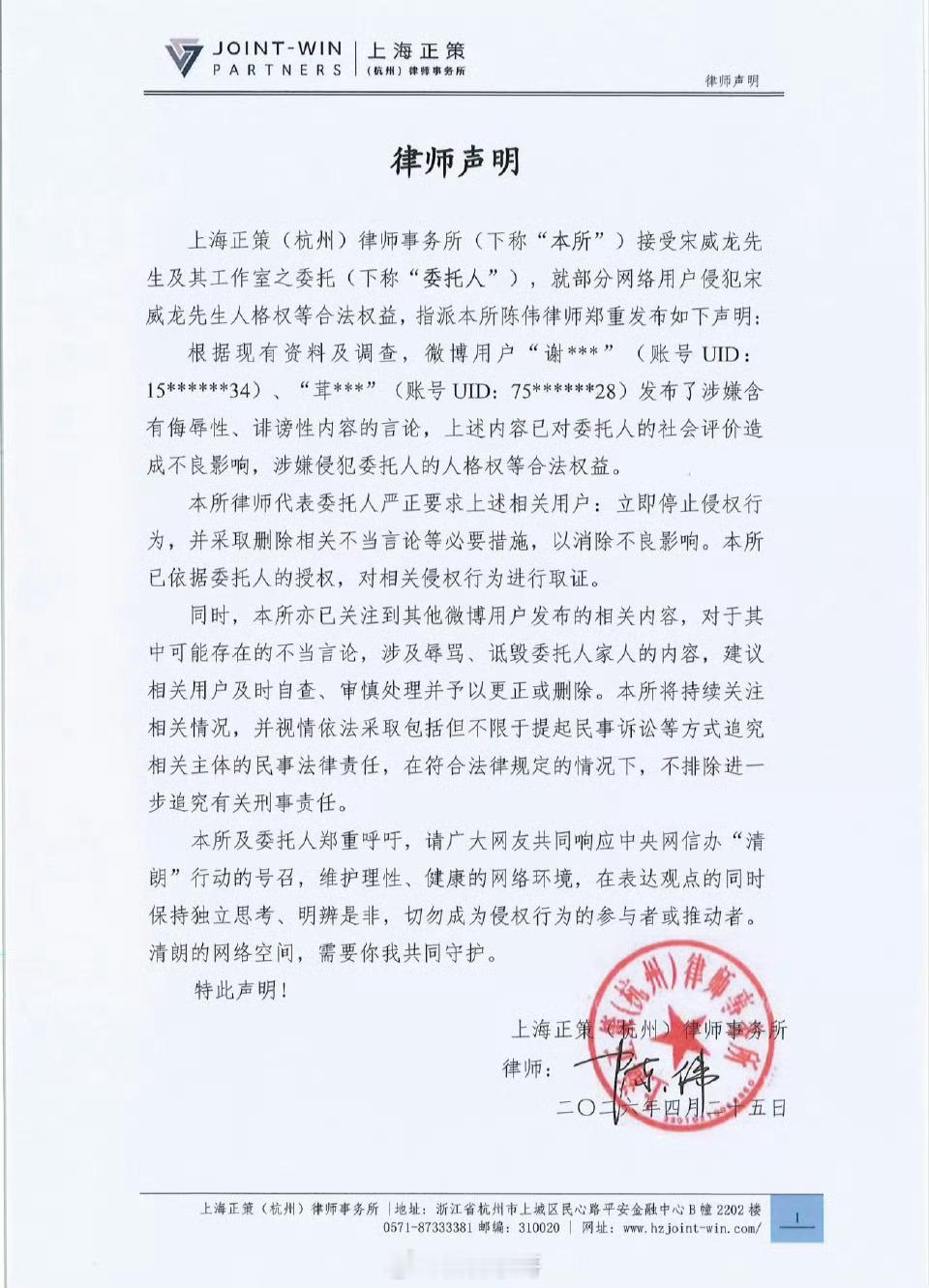 宋威龙工作室发律师声明,称起诉了一些张凌赫粉丝