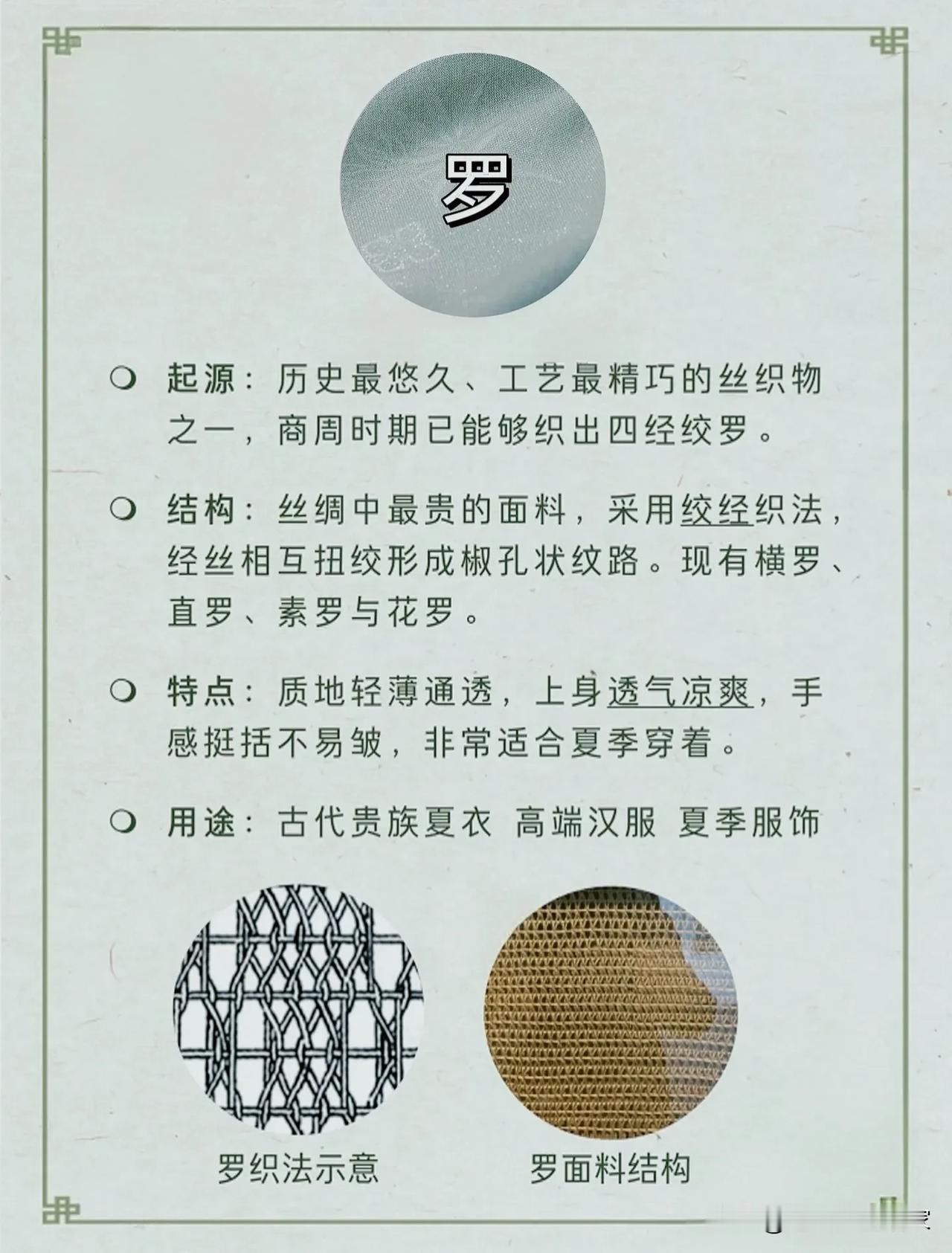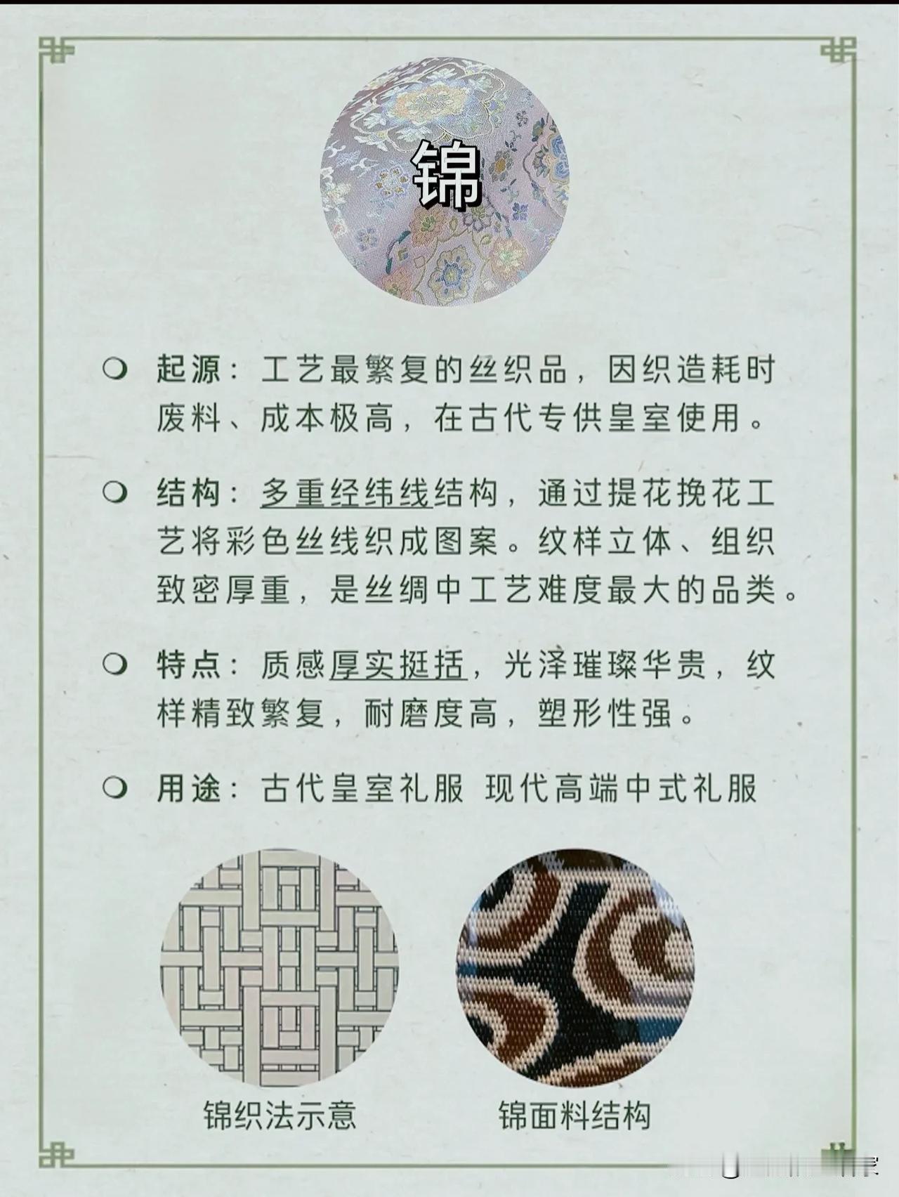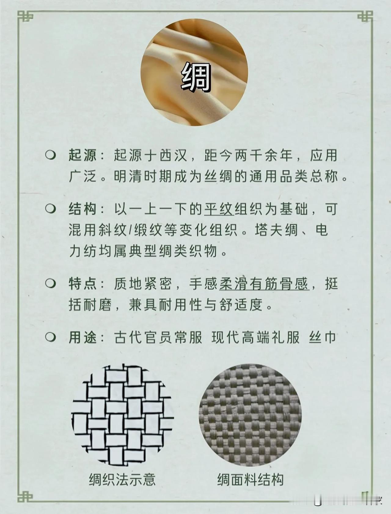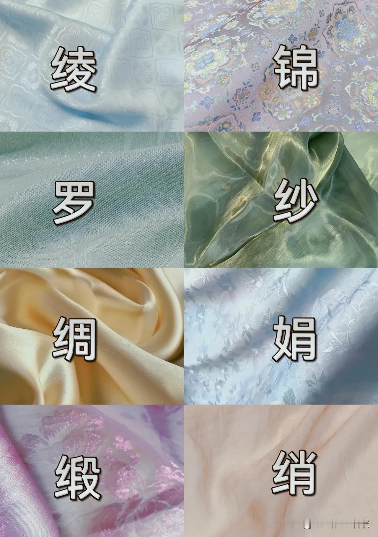 被“绫罗绸缎”骗了多年!原来8种丝绸的差别这么大?! 谁小时候没被古装剧里“绫罗绸缎”四个字骗到过? 总以为这就是个泛指丝绸的词,直到真正了解才发现,绫、罗、绸、缎、锦、纱、绢、绡,这八个字,每一个都藏着完全不同的织造密码和气质灵魂。 它们不是一个模糊的“高级感”标签,而是古代丝绸工艺的八个“段位”。 🧵 「绫」:被低估的斜纹高手 很多人不知道,我们现在穿的牛仔裤,用的就是绫的织法——两上一下的斜纹。 它的特点是轻薄柔软却异常坚韧,就像丝绸界的“牛仔布”,低调耐用。唐宋官袍、爱马仕丝巾,都爱用它。 它的气质:温柔但有筋骨,不张扬却很靠谱。 🧊 「罗」:丝绸里的“贵族工艺天花板” 罗是丝绸里工艺最复杂、也最贵的一种。 它用绞经织法,丝线互相扭绞,形成独特的椒孔纹路,自带透气孔。所以它极适合做夏衣,又挺括又凉快,是古代贵族的“降温神器”。 它的气质:清冷贵气,自带距离感,是汉服圈公认的高端面料。 🧱 「绸」:丝绸界的“万金油” 绸起源于西汉,后来慢慢成了丝绸的通用名,但它本身是个很“实用主义”的面料。 它以平纹组织为基础,质地紧密耐磨,手感顺滑又有筋骨感。古代官员常服、现代高端礼服,都离不开它。 它的气质:百搭耐看,不挑场合,是丝绸里的“实用派”。 ✨ 「缎」:自带高光的“富家千金” 缎,是丝绸里最有“光泽感”的存在。 它的织法让丝线在表面形成长长的浮线,几乎看不到交织点,所以一面光滑如镜,另一面哑光内敛。旗袍、礼服最爱用它,穿上自带柔光滤镜。 它的气质:华丽饱满,垂坠感一绝,是天生的焦点。 🎨 「锦」:寸锦寸金的“重工大佬” 锦,是丝绸里的“顶流工艺”,也是古代专供皇室的面料。 多重经纬线交织,用提花工艺织出立体繁复的图案,成本极高,所以才有“寸锦寸金”的说法。 它的气质:厚重贵气,自带历史感,是中式礼服的首选。 🌬️ 「纱」:自带仙气的“人间薄纱” 纱是丝绸里“轻、薄、透”的极致代表。 经纬线稀疏,交织点少,布面有均匀细小的孔眼,所以透气性极佳,摸起来像云朵一样软,垂感自然,自带仙气。 它的气质:轻盈飘逸,是夏天的代名词,自带柔光效果。 🖼️ 「绢」:自带书卷气的“文艺青年” 绢,是中国最古老的丝织物之一,也是很多传世名画的底材。 平纹组织,经纬线粗细均匀,密度高,所以它细密平整、挺括紧实,自带一种沉静的质感。 它的气质:素雅沉静,自带书卷气,是低调的实力派。 🌫️ 「绡」:丝绸界的“生丝欧根纱” 绡,是唐代贵族女子最爱的罩衫面料,薄如蝉翼。 它用生丝织造,经纬密度极低,孔眼通透,像蚕做的欧根纱,软而不塌,自带筋骨感。 它的气质:朦胧轻盈,自带滤镜,是汉服里的氛围感担当。 很多人觉得丝绸都一样,其实它们的差别,就像不同性格的人。 绫的韧、罗的透、绸的稳、缎的亮、锦的繁、纱的轻、绢的雅、绡的灵,每一种都有自己的脾气和用途。 下次再看到这些面料,别只说“高级”了,它们的故事,远比四个字要丰富得多。 绫罗绸缎 丝绸知识 汉服面料