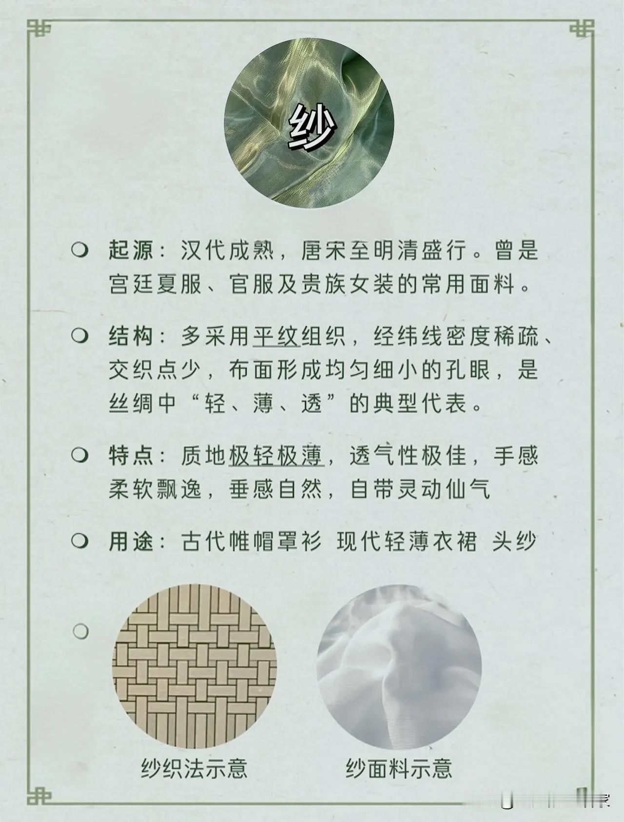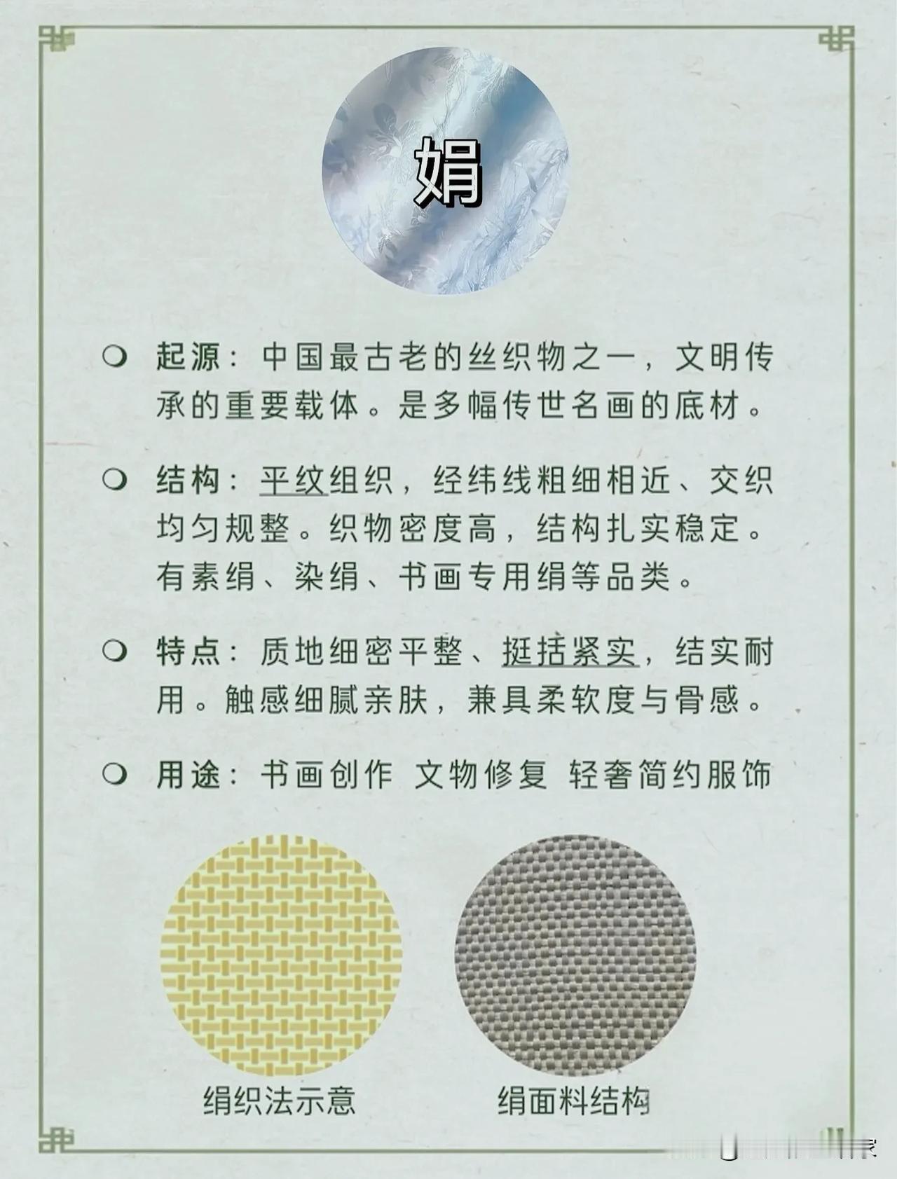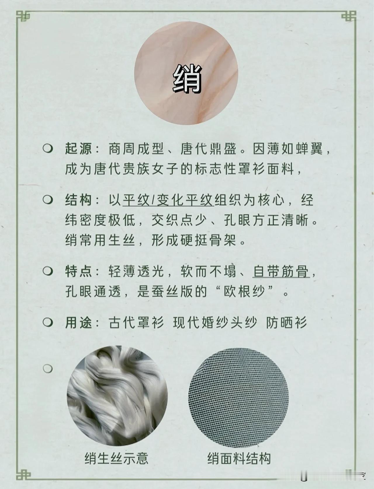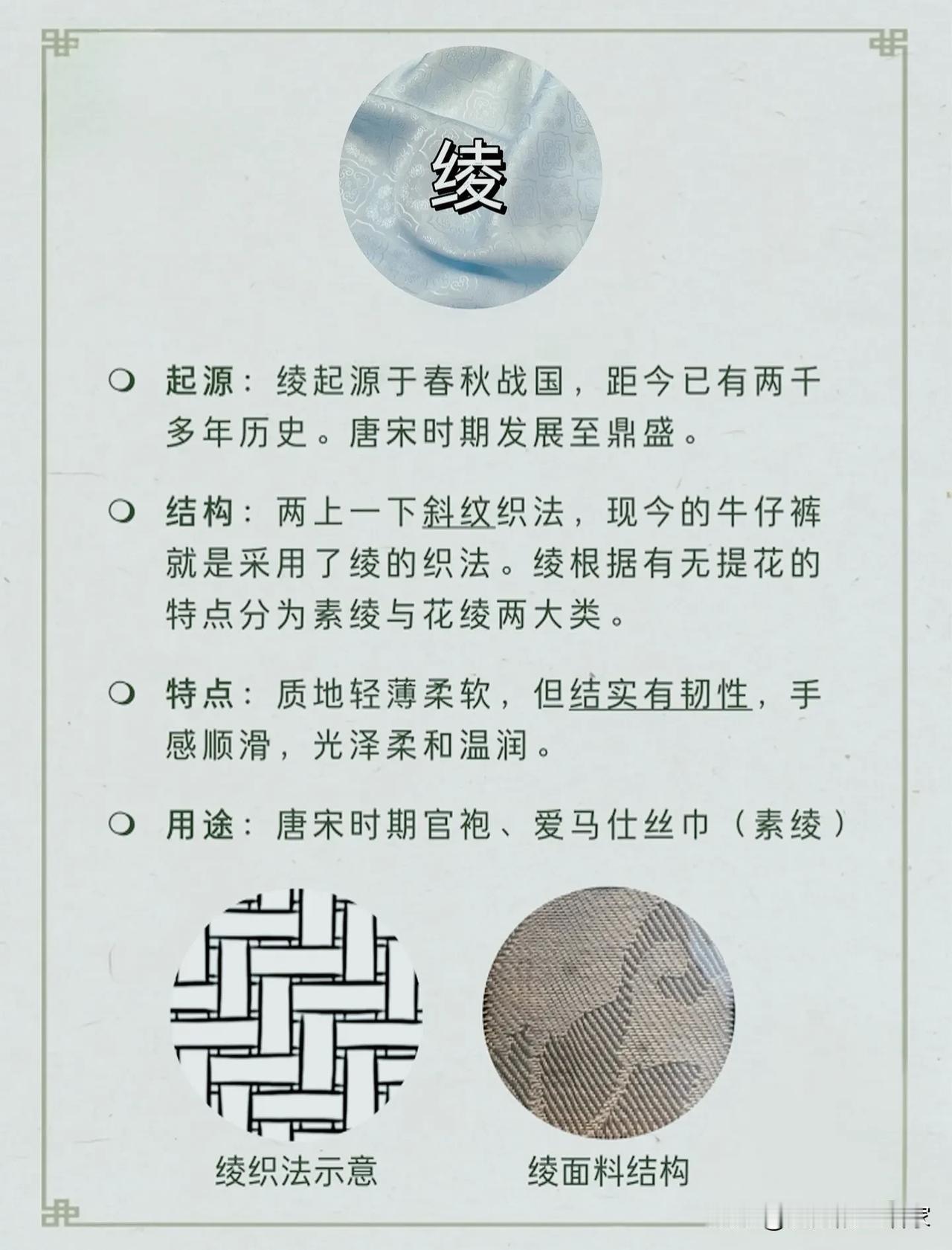 被“绫罗绸缎”骗了多年!原来8种丝绸的差别这么大?! 谁小时候没被古装剧里“绫罗绸缎”四个字骗到过? 总以为这就是个泛指丝绸的词,直到真正了解才发现,绫、罗、绸、缎、锦、纱、绢、绡,这八个字,每一个都藏着完全不同的织造密码和气质灵魂。 它们不是一个模糊的“高级感”标签,而是古代丝绸工艺的八个“段位”。 🧵 「绫」:被低估的斜纹高手 很多人不知道,我们现在穿的牛仔裤,用的就是绫的织法——两上一下的斜纹。 它的特点是轻薄柔软却异常坚韧,就像丝绸界的“牛仔布”,低调耐用。唐宋官袍、爱马仕丝巾,都爱用它。 它的气质:温柔但有筋骨,不张扬却很靠谱。 🧊 「罗」:丝绸里的“贵族工艺天花板” 罗是丝绸里工艺最复杂、也最贵的一种。 它用绞经织法,丝线互相扭绞,形成独特的椒孔纹路,自带透气孔。所以它极适合做夏衣,又挺括又凉快,是古代贵族的“降温神器”。 它的气质:清冷贵气,自带距离感,是汉服圈公认的高端面料。 🧱 「绸」:丝绸界的“万金油” 绸起源于西汉,后来慢慢成了丝绸的通用名,但它本身是个很“实用主义”的面料。 它以平纹组织为基础,质地紧密耐磨,手感顺滑又有筋骨感。古代官员常服、现代高端礼服,都离不开它。 它的气质:百搭耐看,不挑场合,是丝绸里的“实用派”。 ✨ 「缎」:自带高光的“富家千金” 缎,是丝绸里最有“光泽感”的存在。 它的织法让丝线在表面形成长长的浮线,几乎看不到交织点,所以一面光滑如镜,另一面哑光内敛。旗袍、礼服最爱用它,穿上自带柔光滤镜。 它的气质:华丽饱满,垂坠感一绝,是天生的焦点。 🎨 「锦」:寸锦寸金的“重工大佬” 锦,是丝绸里的“顶流工艺”,也是古代专供皇室的面料。 多重经纬线交织,用提花工艺织出立体繁复的图案,成本极高,所以才有“寸锦寸金”的说法。 它的气质:厚重贵气,自带历史感,是中式礼服的首选。 🌬️ 「纱」:自带仙气的“人间薄纱” 纱是丝绸里“轻、薄、透”的极致代表。 经纬线稀疏,交织点少,布面有均匀细小的孔眼,所以透气性极佳,摸起来像云朵一样软,垂感自然,自带仙气。 它的气质:轻盈飘逸,是夏天的代名词,自带柔光效果。 🖼️ 「绢」:自带书卷气的“文艺青年” 绢,是中国最古老的丝织物之一,也是很多传世名画的底材。 平纹组织,经纬线粗细均匀,密度高,所以它细密平整、挺括紧实,自带一种沉静的质感。 它的气质:素雅沉静,自带书卷气,是低调的实力派。 🌫️ 「绡」:丝绸界的“生丝欧根纱” 绡,是唐代贵族女子最爱的罩衫面料,薄如蝉翼。 它用生丝织造,经纬密度极低,孔眼通透,像蚕做的欧根纱,软而不塌,自带筋骨感。 它的气质:朦胧轻盈,自带滤镜,是汉服里的氛围感担当。 很多人觉得丝绸都一样,其实它们的差别,就像不同性格的人。 绫的韧、罗的透、绸的稳、缎的亮、锦的繁、纱的轻、绢的雅、绡的灵,每一种都有自己的脾气和用途。 下次再看到这些面料,别只说“高级”了,它们的故事,远比四个字要丰富得多。 绫罗绸缎 丝绸知识 汉服面料
