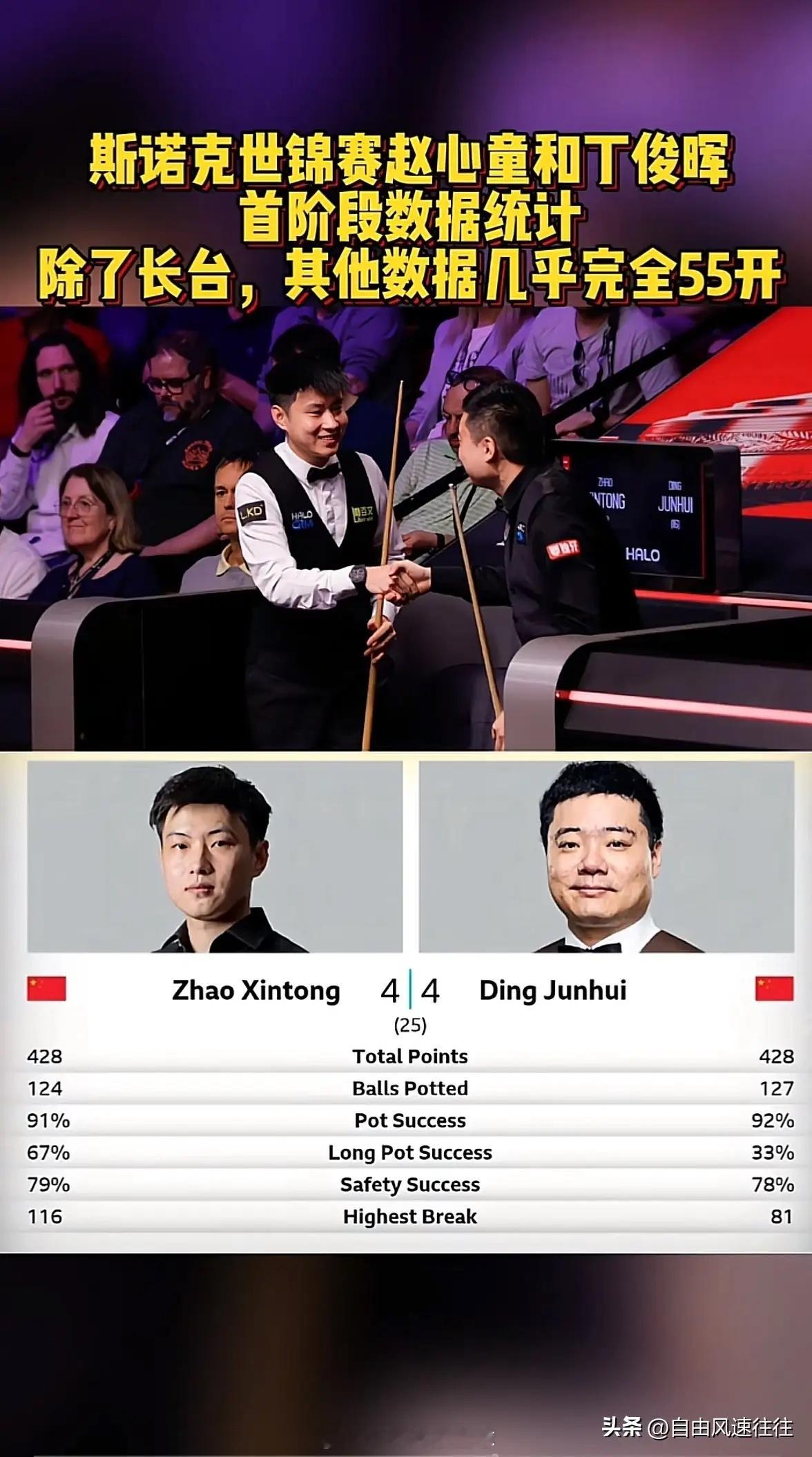 昨天看了比赛,丁俊晖已经是极限超水平发挥了,而赵心童还是慢热,尤其出现简单失误要不就5:3领先了! 下图就是两人的技术统计,除远台差距比较大以外,其他基本相同,尤其是得分能力一样!下半场赵心童必将提升战斗力了,而丁俊晖不可能维持高水平,所以必败!