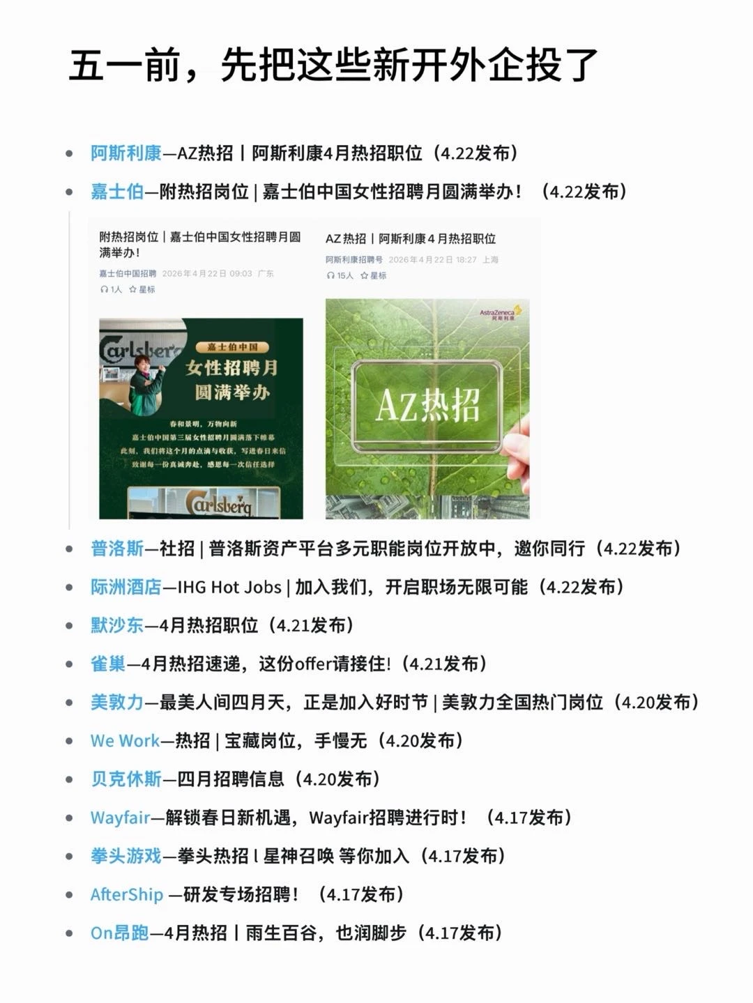 五一前这一波,其实挺适合去捡新岗位。 很多外企刚把HC放出来,还没被一堆人挤爆。 这个时间点投,反而更容易被看到。 别等节后,人会多一倍。 · 为什么可以看看这波新开的外企? ▪️不只是技术岗,运营、市场、职能岗也在补 ▪️年假12天起步基本是标配,不少公司还有额外假期 ▪️工作氛围好,注重WLB,每周都有居家办公 · 坚持日更,帮大家在找工作路上顺利拿 offer! ·