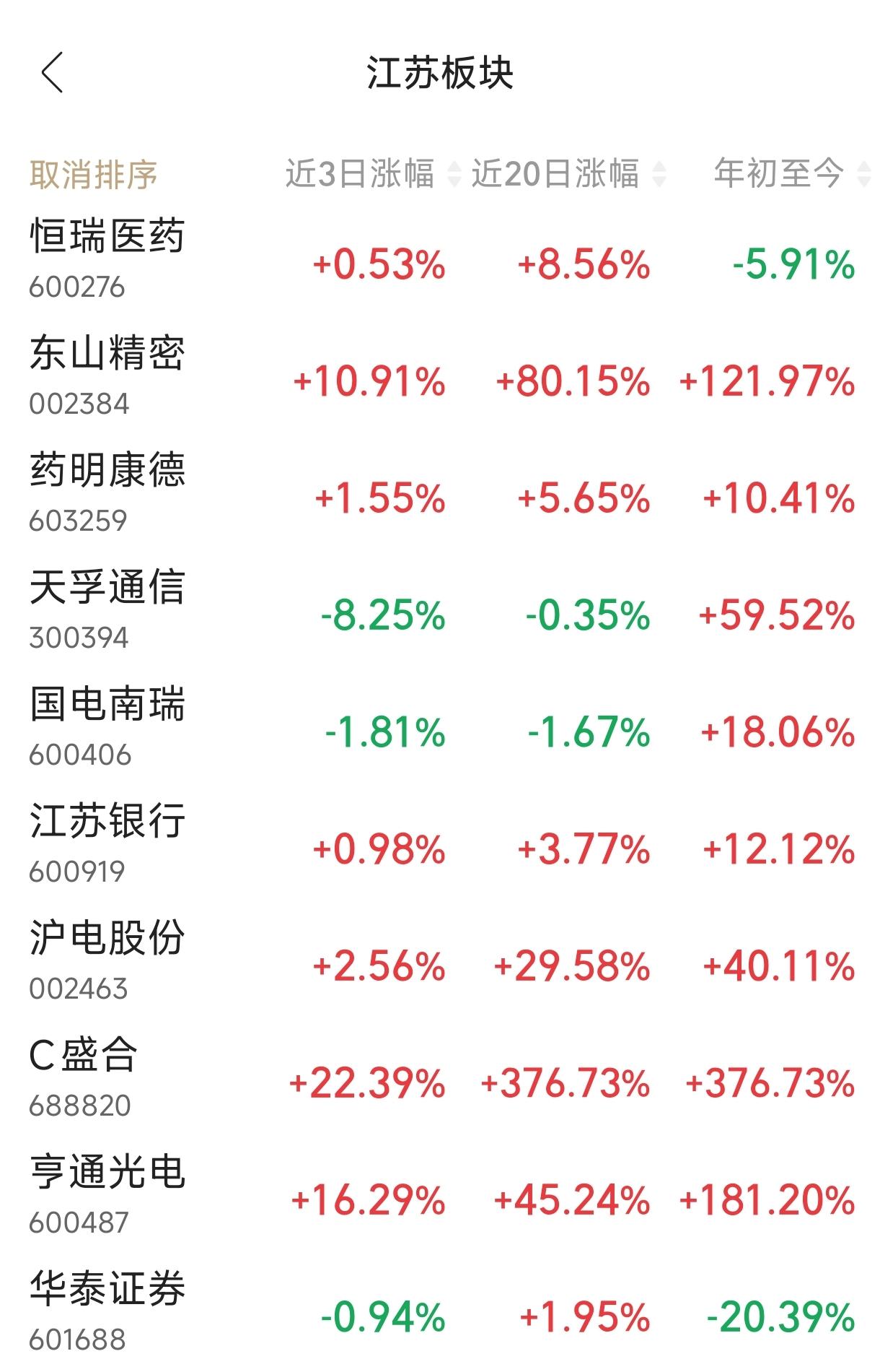 江苏省对浙江省的A股上市公司市值领先优势又扩大了,不过如果算上境外上市公司,浙江公司的市值领先优势还是很明显的。 截至4月24日收盘,江苏省A股上市公司市值10.41万亿元,浙江省A股上市公司市值9.71万亿元,江苏省领先优势来到7000亿元。4月份以来,江苏板块上涨11.15%,浙江板块上涨6.38%,江苏的涨幅更大。 江苏板块的市值增长,以东山精密、沪电股份、亨通光电、盛合晶微、盛科通信等AI相关的公司居功至伟。 东山精密市值3442亿元,本月增长82%; 沪电股份市值1970亿元,本月增长35%; 亨通光电市值1715亿元,本月增长32%; 盛科通信市值1109亿元,本月增长62%; 盛合晶微市值1747亿元,4月21日才上市。 不过,浙江省市值最高的三家公司阿里巴巴(大约22300亿元)、网易(4780亿元)、农夫山泉(4623亿元)都不在A股上市,他们的市值加起来有32700亿元。算上境外上市公司市值,浙江还是显著高于江苏的。今日A股 浙江 美丽浙江 江苏