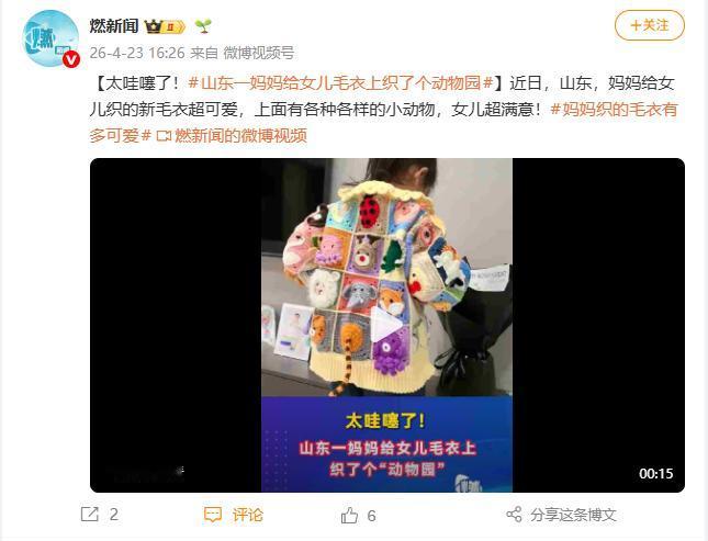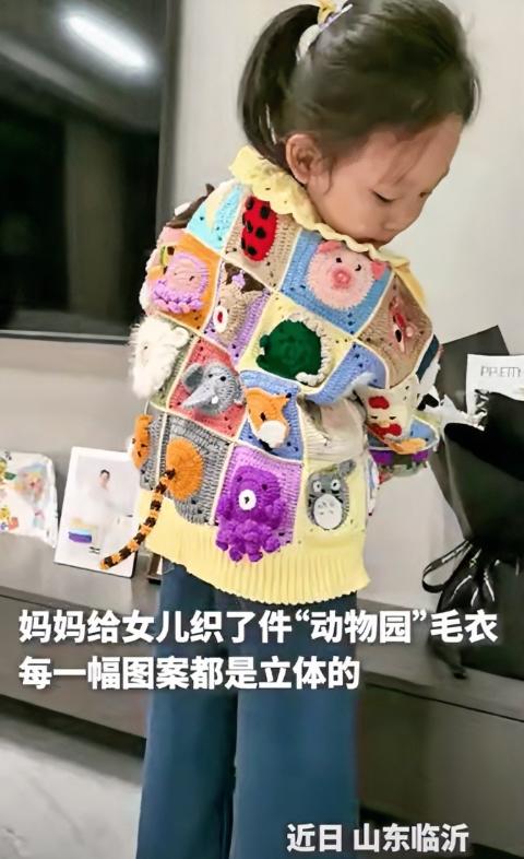火到人民日报了!4月23日,山东临沂,女儿喜欢小动物,万万没想到,妈妈给她织了一件特别的毛衣,浑身都是五颜六色的小动物,而且还是立体的,让同学羡慕得直流口水!网友说:这满身都是母爱啊! 山东临沂,女孩穿着一件特别的毛衣走进教室,瞬间吸引了全班同学的目光。五颜六色的立体小动物布满整件衣服,栩栩如生、质感十足,小到绒毛纹理都精致入微。 同学们纷纷围拢过来,满眼羡慕,连下课都频频打量触摸。这份专属温暖不仅刷屏校园,更火上人民日报,在全网掀起一阵温暖热潮。 女孩从小就特别喜欢小动物,不管是小区里的猫狗,还是路边的小兔松鼠,都能让她驻足观察。她总念叨着想要一件布满小动物的衣服,就连画画也总以小动物为主题,把它们当作自己的小伙伴。 妈妈默默记着女儿的愿望,没有买现成衣服,觉得市面上的款式不够特别,承载不了自己的心意。思来想去,她决定亲手织一件毛衣,把女儿喜欢的小动物,一针一线织在衣服上,送上独一无二的惊喜。 为了织好毛衣,妈妈精心挑选了柔软亲肤又有支撑力的中粗混纺线材,既能凸显立体花样,又贴合女孩喜好。她搭配了马卡龙色系和中性色,既符合2026年手工编织“纹理怀旧”趋势,又显得活泼精致。 妈妈没有任何编织基础,连起针、收边都不会。她下载教程利用碎片时间学习,每一步都反复练习,一个简单针法就要练几十遍。她用前后柱长针勾勒动物轮廓,再用不同颜色毛线填充,让每只小动物都立体饱满、活灵活现。 编织时妈妈格外细心,动物的眼睛、耳朵等小细节都反复调整。她利用下班、女儿睡着后的时间,每天织几个小时,有时熬到深夜,手指磨得发红起茧,揉一揉就继续,丝毫没有懈怠。 为了让毛衣更耐穿美观,妈妈还特意学习专业缝合技巧,放弃生硬的引拔拼接,选择柔软贴合的方式,收边时用外钩短针压出利落线条,每一处细节都藏着对女儿的用心。 经过近20天的忙碌,毛衣终于织成。衣服色彩鲜艳不杂乱,小猫、小兔、松鼠等小动物错落分布,栩栩如生,摸起来蓬松柔软,立体纹理仿佛让小动物要跳下来,完全超出预期。 周末,妈妈把毛衣当作惊喜送给女儿。女孩瞬间眼睛发亮,迫不及待穿上,大小合身、舒适无束缚。看着衣服上的立体小动物,她笑得合不拢嘴,一遍遍抚摸,连睡觉都舍不得脱下。 第二天,女孩穿着毛衣上学,刚进教室就被同学们围住。大家盯着衣服上的小动物,小心翼翼触摸感受立体感,满眼向往,连老师都忍不住夸赞毛衣精致特别。 同学们纷纷称赞毛衣好看,直言从未见过这么特别的款式,个个露出羡慕神情,甚至有人拉着女孩衣角,说也想要妈妈织一件。这份纯粹的羡慕,让女孩满心自豪,也更加珍惜这件毛衣。 妈妈看着女儿开心,随手拍下毛衣和编织片段分享到网上,本想记录心意,没想到帖子迅速走红,点赞评论飙升,还被人民日报转发点赞,网友纷纷感慨,这件毛衣满身都是藏不住的母爱。 妈妈坦言,起初担心织不好,好几次想放弃,可一想到女儿的期待就咬牙坚持。她没有刻意讨好大众审美,只是把女儿喜欢的元素融入其中,没想到收获这么多关注。 她透露,编织这件毛衣用了6种颜色毛线,耗时近20天,累计编织时长超60个小时。每一针每一线都凝聚着对女儿的爱,比买的衣服更有意义,也更能传递温暖。 女孩穿着这件毛衣,走到哪里都是焦点,邻居、路人都会多看几眼,夸赞毛衣精致、妈妈心灵手巧,每一次称赞都让妈妈满心欣慰,觉得所有辛苦都值得。 网友们表示,手工编织的温度是机器无法替代的,这件毛衣没有昂贵价格和复杂设计,却用一针一线编织出最动人的温暖,难怪能火上人民日报,这样的母爱格外动人。 对此,你们有什么看法,欢迎评论留言~