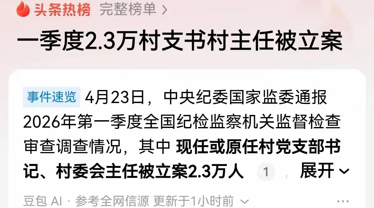 继去年农村现任或原任村党支部书记、村委会主任9.1万人后,4月23日中央纪委国家监委又通报一季度立案24.5万件。其中,立案这一群体农村干部2.3万人。 “千里之堤溃于蚁穴”是一个惨痛的经验教训,农村村干部反腐工作的深入,是一次“刮骨疗毒”式的自我救赎。选对人很重要,但是用科学、合理的制度约束干部的权力更重要!