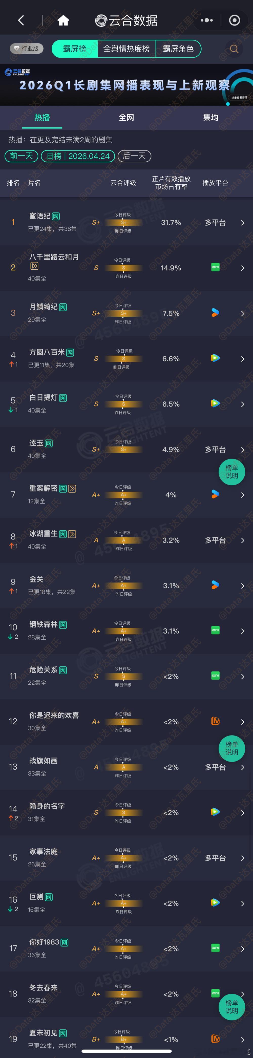4.24云合占比蜜语纪 31.7%,约5355万八千里路云和月 ⏩超点完结 约2515万月鳞绮纪 7.5%,约1265万方圆八百米 6.6%,约1115万白日提灯 6.5%,约1100万逐玉 4.9%,约825万重案解密 4%,约 675万冰湖重生 3.2%,约540万