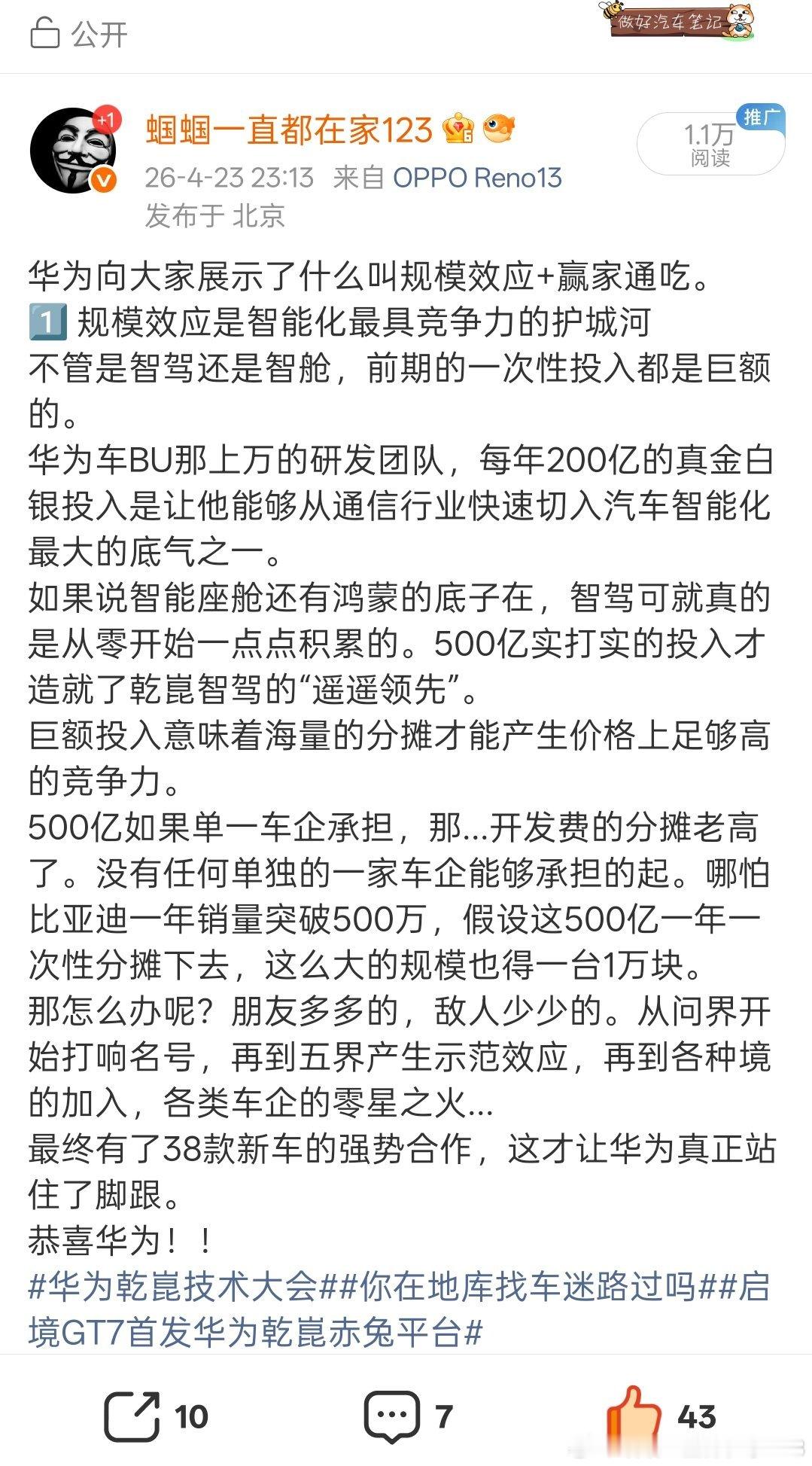 关于华为乾崑技术大会,我前几天发了条微博【图1】最大的感慨就是...规模效应成了最大的护城河。