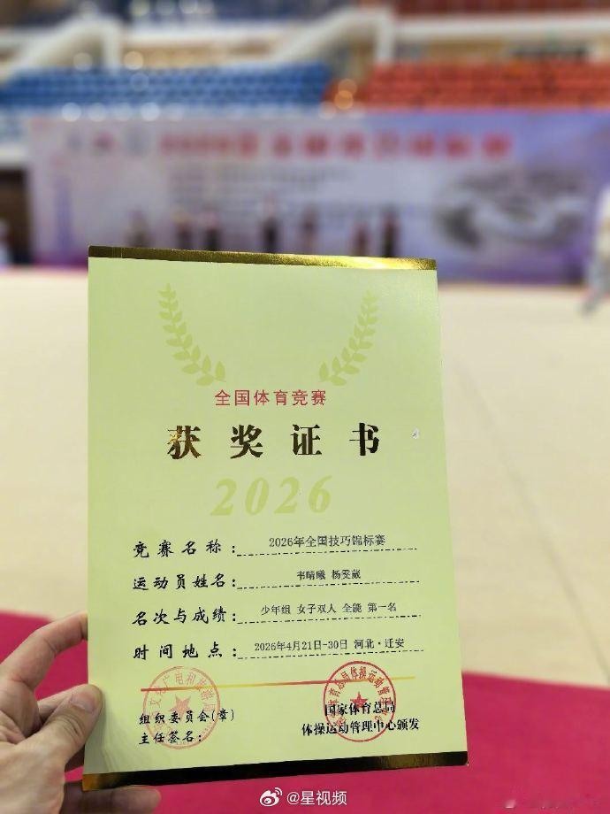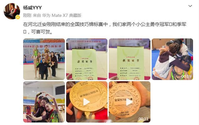 【杨威两女儿勇夺全国冠军和季军】4月24日,体操奥运冠军分享喜讯并晒出获奖证书和奖牌:在河北迁安刚刚结束的全国技巧锦标赛中,我们家两个小公主勇夺冠军和季军,可喜可贺。
