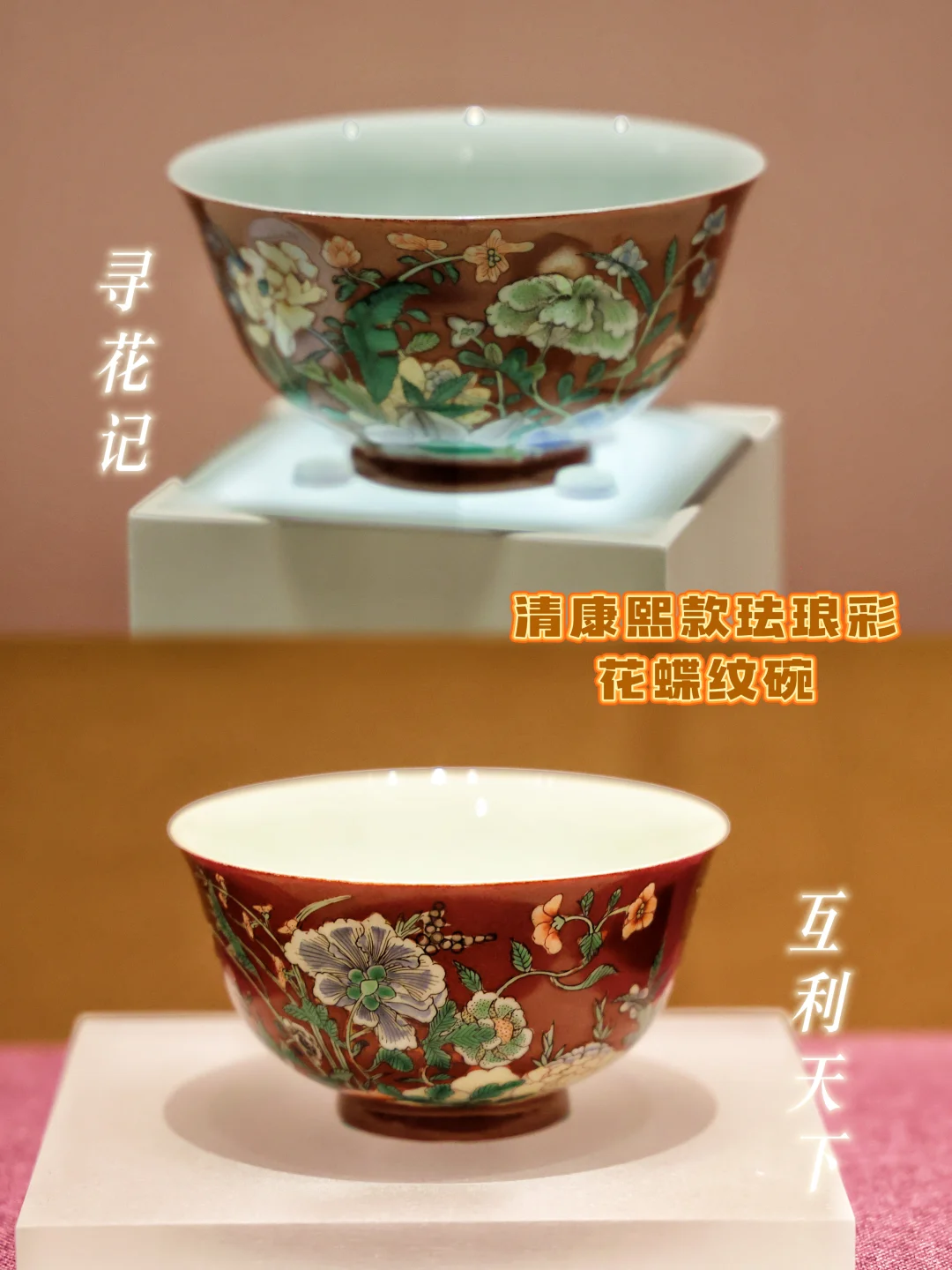展厅有一个超高人气的美碗,有一个好像是教师的人和同伴一直在介绍这个宫廷御用珐琅彩重器,红釉为底明艳雅致,珐琅彩料妍丽饱满。繁花灼灼盛放,彩蝶翩跹逐香,我看第一眼觉得很眼熟,感觉是从隔壁互利天下搬过来的,结果没想到在走过互利天下才发现,原来这两个碗,可能是一对的🤭🤭🤭