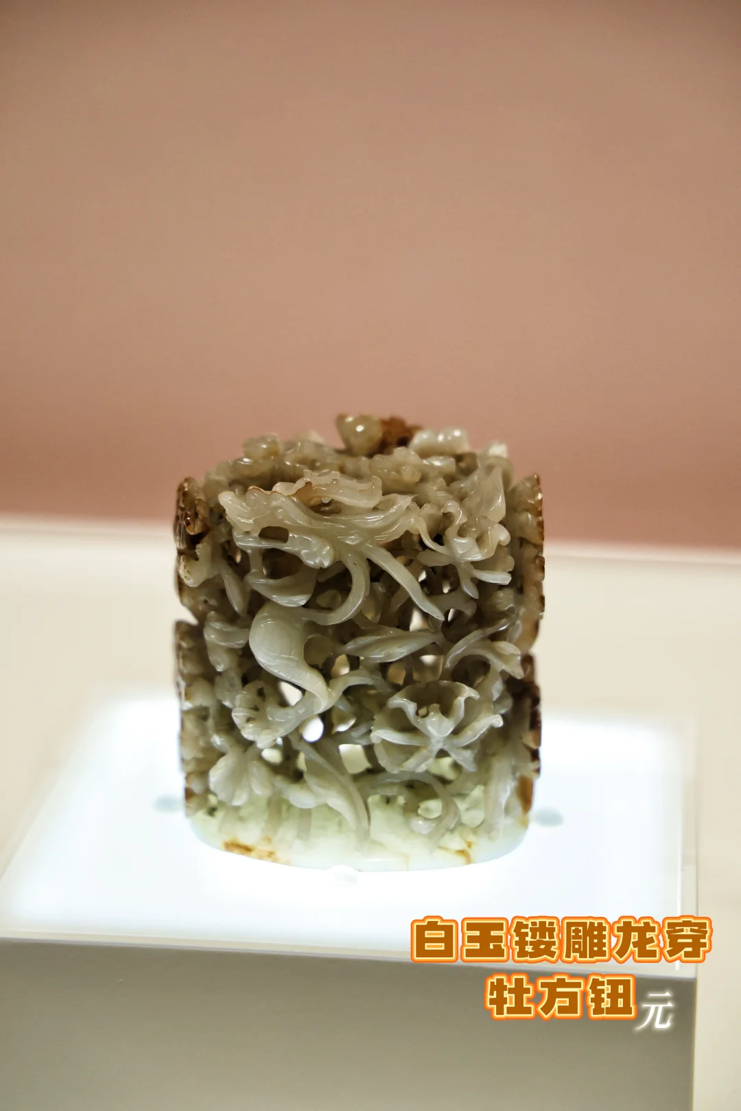 在这里,大家要去细看这件被誉为“钮王”的元代玉钮,是此行最惊艳的遇见。听说很少会展出,采用多层立体镂雕技法,矫健苍龙盘旋穿梭于雍容牡丹之间,龙姿遒劲灵动,花瓣层叠舒展、枝叶缠绕婉转。刚猛龙纹邂逅富贵牡丹,刀工豪放又不失细腻,玉质温润莹泽,历经数百年岁月依旧风华不减,将中式富贵吉祥的美学刻入方寸玉石之间。