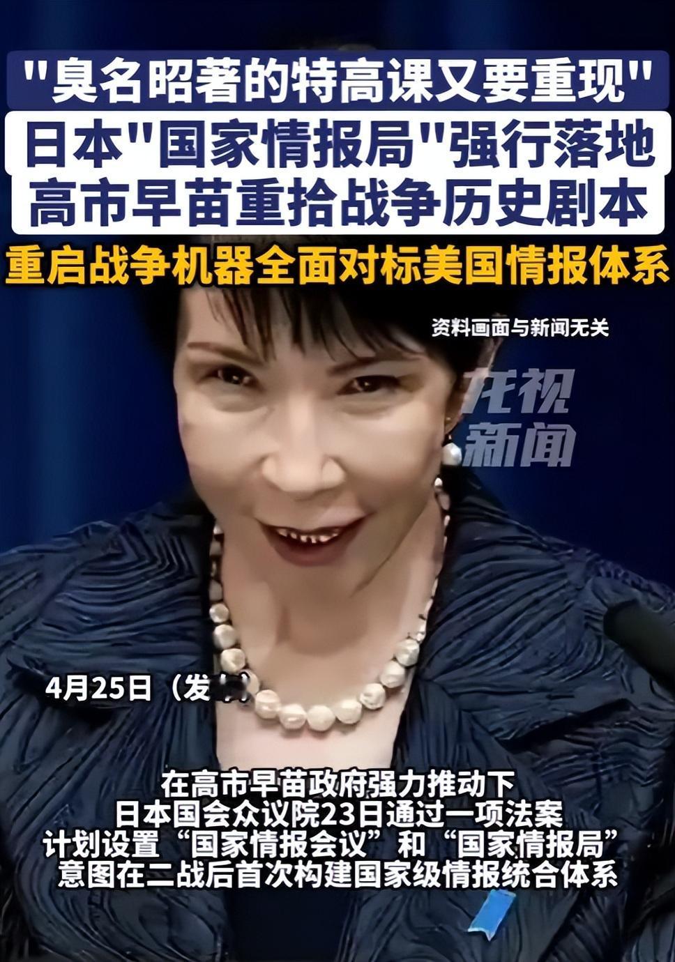 炸锅!日本特高科借尸还魂,高市早苗强行夺权,掌控全国情报生杀大权 4月23日,日本众议院以绝对优势强行通过了《国家情报局法案》。按照这个法案,日本要搞一个以“国家情报会议”为核心、“国家情报局”为执行机构的新体系。 这个“国家情报会议”由首相高市早苗亲自担任议长,成员全是内阁高官,而“国家情报局”则被赋予了要求政府所有省厅无条件提供情报的综合协调权。 说白了,就是高市早苗一个人就能调动全国的情报资源,什么外务省、防卫省、警察系统,所有机密资料她都能直接调取,连交叉验证都不需要。 你可能会问,这跟当年的特高课有啥关系?特高课是二战时期日本臭名昭著的情报机构,专门搞国内监控、镇压反战声音、迫害异见人士。现在这个“国家情报局”,权力集中程度比特高课有过之而无不及。 日本庆应义塾大学的名誉教授金子胜说得一针见血,他在社交媒体上直接指出,高市政府这是想通过修宪和军事化来掩盖日本即将到来的经济崩溃,现在又限制民众言论自由、压制社会声音,这一切都是在“重蹈覆辙”。 连日本社民党党首福岛瑞穗都担心,政府嘴上说不会随意调查“普通市民”,但“普通市民”和“非普通市民”的界限到底怎么划?根本说不清楚。 这个法案通过的时间点非常微妙。就在法案通过前两天,也就是4月21日,日本政府刚刚修改了武器出口三原则,允许出口杀伤性武器。一边放开武器出口,一边加强情报控制,这摆明了就是要为军事扩张铺路。 有评论直接指出,高市早苗设立“国家情报局”,就是想打造日本版的美国中央情报局,提升情报能力,为日本的安保政策转型和强化防务能力服务。说得直白点,就是为打仗做准备。 日本国内也不是没有明白人。在野党“中道改革联合”的代表小川淳也早就警告过,“国家情报局”搜集的情报存在被政治利用的风险。日本共产党籍的众议员盐川铁也更是直接炮轰,说建立这种践踏宪法第九条和基本人权的体制绝不能被允许,法案应该被废除。 但是,这些反对声音在高市早苗的强力推动下,根本挡不住。就连日本媒体都普遍认为,尽管执政联盟在参议院议席未过半,但由于部分在野党也投了赞成票,这个法案在参议院通过基本是板上钉钉的事。 那么问题来了,高市早苗为啥这么着急要搞这个“国家情报局”?根本原因就在于,她上台以来一直在推动日本走向“正常国家化”,说白了就是要突破和平宪法的限制,重新武装日本。 而一个强大的、集中统一的情报机构,正是实现这个野心的关键工具。通过这个机构,她不仅可以更好地监控国内的反战声音和异见人士,还能更有效地为军事行动提供情报支持。 中国国际问题研究院的研究员项昊宇分析得很透彻,高市政府推动设置“国家情报局”的真实目的,就是强化首相对国家安全保障权力的全方位掌控,进而为安保政策转型与修改和平宪法铺路。 所以,东京审判过去才80年,有些人就已经忘了疼。当年的特高课是怎么用情报手段迫害民众、为军国主义服务的,历史书上写得清清楚楚。 现在高市早苗搞的这一套,虽然披着“国家安全”和“反恐”的外衣,但内核跟特高课没啥两样,都是通过集权化的情报控制,来压制不同声音,为对外扩张做准备。 日本社会民主党党报《社会新报》说得更直接,该法案的首要危险就在于,“情报”这一概念本身就与军事活动密不可分。强化信息收集体制,必然导致对市民的监视加强,侵犯个人隐私。法案另一个致命缺陷是缺乏透明性和监督机制,政府基于什么情报做决策,外界根本无从验证。 总而言之,高市早苗强行推动《国家情报局法案》,绝不是为了什么“整合情报资源、提高效率”那么简单。这是一场精心策划的权力集中,目标直指修改和平宪法、实现重新武装。 而一个不受制约、权力无限的情报机构,将成为她实现这一野心的最锋利工具。历史总是惊人的相似,80年前的悲剧会不会重演,就看国际社会能不能保持足够的警惕了。