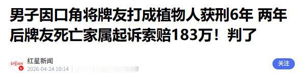 4月24日,江苏东台,一男子与牌友打牌时发生口角,抬手一拳将对方打倒,致其后脑勺着地成植物人,住院74天花费医疗费20.2万余元,男子垫付1.4万元,因故意伤害罪被判有期徒刑6年。其服刑期间,伤者死亡,家属起诉该男子及事发时另一牌友,索赔183万,法院做出了相应判决。 江苏东台,当地一处民房里,几名牌友围坐在一起打牌,消磨闲暇时光。原本气氛还算融洽,大家有说有笑,可玩着玩着,其中两名男子因出牌意见不合,渐渐起了争执,语气越来越冲,矛盾瞬间升级。 争执越来越激烈,其中一名男子情绪失控,没控制住怒火,抬手就朝着另一名牌友的面部打了一拳。力道之大,让被打男子来不及反应,直直向后仰面摔倒,后脑勺重重磕在地面上,当场就没了声响。 在场的其他牌友都吓懵了,连忙上前查看,发现被打男子意识模糊,无论怎么呼喊都没有回应,头部还渗出了血迹。大家不敢耽误,立刻拨打急救电话,将被打男子紧急送往附近医院抢救,祈祷能有转机。 医院经过紧急抢救,虽保住了被打男子的性命,却给出了让人揪心的诊断:外伤性颅脑损伤,呈持续性植物生存状态,也就是俗称的植物人,损伤程度构成重伤一级,伤残等级为一级。 为了救治被打男子,家属辗转多家医院,花费了大量的时间和金钱。整整住院治疗74天,各项医疗费、检查费、护理费等加起来,一共花了20.2万余元,这笔巨额开销,让家属承受着巨大的经济压力。 事发后,动手打人的男子,主动垫付了1.4万元医疗费,之后就再也没有承担任何费用。没过多久,他因犯故意伤害罪,被东台市人民法院判处有期徒刑6年,投入监狱服刑,为自己的冲动付出了代价。 本以为事情会就此告一段落,可谁也没想到,在打人男子服刑期间,被打成植物人的牌友,因脑外伤引发的并发症,经抢救无效死亡,这份迟来的死亡,让这场悲剧再次升级。 痛失亲人的家属,无法接受这样的结局,认为打人男子和事发时在场的另一牌友,都有不可推卸的责任。于是整理好相关证据,正式将两人诉至法院,索赔医疗费、丧葬费、护理费等各项损失,共计183万余元。 家属认为,打人男子的一拳是悲剧的根源,而另一牌友在场却未及时劝阻,放任冲突升级,也应承担相应责任,两人都需为亲人的死亡承担赔偿责任,弥补自己的损失和伤痛。 法院结合案件实际情况,依据相关法律规定,综合考量各方过错程度,最终做出判决:打人男子承担全部侵权责任,扣除已垫付的1.4万元,再赔偿家属各项损失42.3万余元,另一牌友无过错,不承担赔偿责任。 判决结果出来后,家属虽有不甘,但也接受了这个结果,再多的赔偿,也换不回亲人的生命,这份判决,只是对他们悲痛心情的一丝慰藉,却无法弥补永远的伤痛。 打人男子在监狱得知判决结果后,没有提出上诉,默默接受了这份额外的赔偿责任。他或许也没想到,自己一时的冲动,不仅毁掉了别人的家庭,也让自己背负了沉重的债务和一生的愧疚。 事发时在场的另一牌友,虽被驳回了家属的索赔,却也留下了心理阴影,坦言若是当时及时劝阻,或许就不会酿成这样的悲剧,往后再遇到类似冲突,一定会第一时间制止。 对此,你们有什么看法,欢迎评论留言~