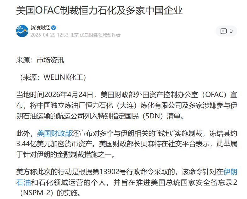 美国终于动手了!中东战火直接烧到中国家门口,40 万桶 / 日炼油厂被全面制裁 4 月 24 日深夜,一条来自美国财政部的公告震惊了整个中国能源界。美国突然对中国最大的民营炼油厂之一 —— 恒力石化大连炼化厂下了死手,直接将其列入了最严厉的 "特别指定国民清单"。 与此同时,近 40 家涉及伊朗石油运输的航运公司与油轮也被一网打尽。美国财长贝森特更是放出狠话,谁敢和伊朗做生意,就等着承受美国的 "经济轰炸"。 这已经不是贝森特第一次对中国发出这样的威胁了。就在4月15日的白宫简报会上,贝森特就曾专门点名中国,称中国购买了伊朗90%以上的石油出口,约占中国年度石油采购总量的8%。 他当时就曾狂妄地断言,随着美国对伊朗实施海上封锁,中方将会"暂停采购"伊朗石油。美国财政部甚至还专门致函两家中国银行,警告它们如果被证明有伊朗资金通过账户流动,将面临严厉的二级制裁。 那么,美国为什么偏偏选择在这个时候,将制裁大棒挥向恒力石化呢?答案其实很简单,因为恒力石化是伊朗原油在中国市场的最大买家之一。 根据美国财政部的指控,恒力石化自2023年起就持续接收伊朗原油,累计采购金额达数十亿美元,为伊朗军方创造了数亿美元的收入。恒力石化大连炼化设施拥有每日约40万桶的原油加工能力,是中国民营炼化行业的龙头企业。 更重要的是,美国此次制裁发生在中东局势极度敏感的时刻。自美国和以色列对伊朗发起大规模军事行动以来,中东地区就一直处于战争边缘。 4月12日,特朗普更是宣布对进出伊朗港口的所有海上交通实施全面封锁,覆盖波斯湾和阿曼湾所有伊朗沿海区域。 然而,美国的军事封锁并没有达到预期效果,伊朗原油仍然通过各种隐蔽渠道源源不断地运往中国市场。 中国海关总署和国际能源署的数据显示,2026年1-2月,中国自伊朗进口原油数量同比增幅超过三成,单月进口规模跃升至百万吨以上。 这显然是美国无法容忍的。对美国来说,伊朗的石油收入是其维持战争机器运转的核心支柱。 如果不能切断伊朗的石油出口,美国对伊朗的军事和经济压力就会大打折扣。而中国作为伊朗石油最大的买家,自然就成了美国的眼中钉、肉中刺。 美国此次制裁恒力石化,表面上是针对伊朗,实际上是想通过打击中国企业,逼迫中国放弃与伊朗的能源合作,从而达到孤立伊朗的目的。 然而中国在能源安全方面早就做好了充分的准备。经过多年的努力,中国已经构建了多元化的石油进口体系。 2026年3月的数据显示,俄罗斯已经超过沙特成为中国最大的原油供应国,占比达到22.5%。巴西、阿曼等国的原油进口量也在大幅增长。 此外,中国还建成了中俄、中哈、中缅三条陆上石油管道,合计年输油量超过7200万吨,相当于每日约144万桶,可覆盖30%以上的霍尔木兹海峡缺口。 这些都意味着,即使中国完全停止进口伊朗石油,对中国整体能源安全的影响也非常有限。2025年中国总石油进口量中,伊朗占比仅为13.4%。 而且,伊朗石油之所以能够在中国市场占据一席之地,主要是因为其价格比国际均价低8-10美元/桶,还能用人民币结算,每年能为中国节省300多亿美元。 美国显然也清楚这一点。那么,美国为什么还要冒着与中国彻底翻脸的风险,执意制裁中国企业呢? 因为美国的真实目的,从来就不是单纯地针对伊朗。美国此次行动,本质上是极限施压伊朗、遏制中国能源自主、维护美元霸权的组合拳。 美国一直试图通过控制全球石油贸易,来巩固美元的霸权地位。而中国与伊朗之间的人民币结算石油贸易,正是对美元霸权最直接的挑战。 如果越来越多的国家开始效仿中国,用本国货币结算石油贸易,那么美元作为全球储备货币的地位就会受到严重动摇。这才是美国最担心的事情。 此外,美国还想通过此次制裁,向全世界展示其"长臂管辖"的威力,警告其他国家不要与美国的敌人做生意。美国试图通过这种方式,建立一个以美国为中心的全球经济秩序,任何不服从美国命令的国家和企业,都将受到严厉的惩罚。 然而,美国的如意算盘恐怕要落空了。历史已经多次证明,制裁从来都不是解决问题的有效手段,反而会适得其反。 美国对伊朗的制裁已经持续了几十年,但伊朗并没有因此而屈服,反而变得更加独立自主。同样,美国对中国的制裁也不会让中国放弃自己的原则和利益。 恰恰相反,美国的制裁只会进一步加速中国的去美元化进程,推动中国与其他国家之间的本币结算贸易。 美国的制裁也会让更多的国家认识到,过度依赖美元和美国主导的金融体系是多么危险的事情,从而促使它们寻求更加多元化的国际金融体系。