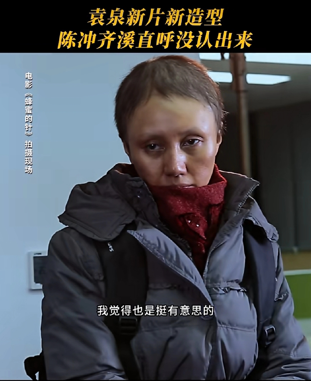 袁泉为了拍电影《蜂蜜的针》“自毁形象”了。这个造型对一向喜欢塑造干练强势的女强人的袁泉来说真的是一个挑战了。难怪好友陈冲齐溪直呼没认出来呢!