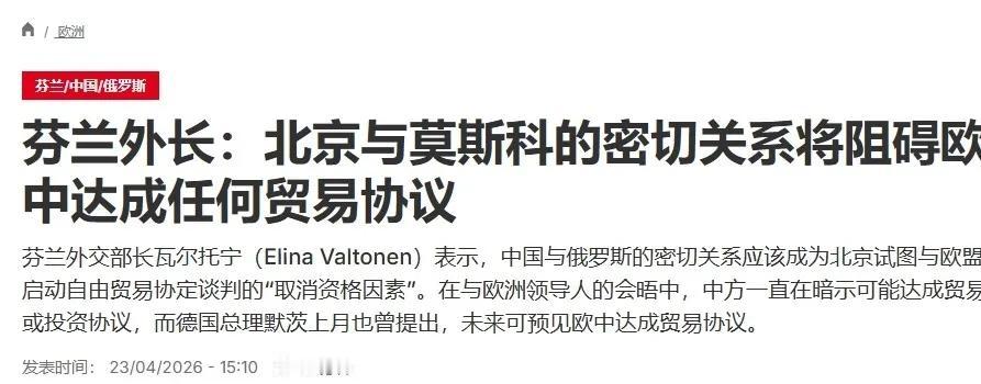 芬兰外长“放狠话”:中国不和俄罗斯保持距离,芬兰将一票否决欧盟与华贸易协议。 4月23日,一条来自芬兰的外交威胁在欧洲政坛激起涟漪。芬兰外长瓦尔托宁在一次公开场合“放狠话”:假如中国不和俄罗斯保持距离,芬兰将利用欧盟决策机制一票否决与中国的贸易协议。 这并非内外交困下的权宜之计,而更像是欧洲当前心态的缩影。 把简单的问题掰开了说,其实就是欧洲在中俄关系上越来越敏感——但手里掌握的筹码有限,却依然习惯用高调姿态对他国指点江山。 芬兰外长这番言论反映出,哪怕是体量有限的小国,也愿意在重大的地缘议题面前刷一波存在感。 现实却是,欧盟军令如山,但每次都得所有国家点头才走得通,而任何成员国的否决权都能成为谈判中的“杠杆”。 如今的欧洲政策,表面挂着价值观的大旗,但遇到现实问题时,选择性执法已经成了常态。 对俄罗斯动辄制裁,对以色列“战争行为”却遮遮掩掩,大棒小甜头变化无常。 在中国问题上,一方面指望中国加大原材料供应,另一方面又想插手中俄互动,这种两头讨好的操作实际上不太管用。眼下欧盟正深陷能源焦虑和经济增长疲软。 中国作为最大的贸易伙伴之一,单靠喊话和施压根本换不来什么实质红利。 软硬兼施的欧洲方式其实早就被看穿了。喊得凶却做不到真正强硬,制裁名单罗列得密密麻麻,但真要实施时又变得束手束脚。 一边要求中国承担“道义责任”,一边又推着自家企业拼命抢进中国市场。这种时候,奉劝别人“离某某远点”也未免有些“坐井观天”。 合作还是脱钩,本质还是利益算计和现实博弈。精明的欧洲政客很清楚,中欧经贸往来谁都离不开谁,把政治压力捆绑进商业谈判未必能得偿所愿。 其实,大家都需要务实一点,别总想着在国际舞台上当裁判员,更别把地缘矛盾生搬硬套进双向合作。 利益优先才是国际交往的基本逻辑,高姿态终归是吓唬不了谁的。 总的来看,芬兰外长的表态是一次带着指点意味的姿态秀,但对双方实打实的贸易注定影响有限。 欧洲要是真的想提升自己的分量,不如少点口号,多想点办法,扎实推进互利合作,可能更容易换来肯定的答复。