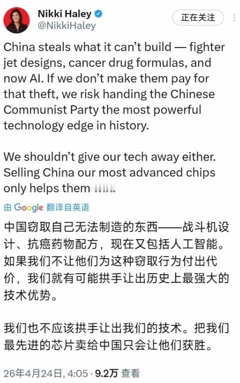 美国前驻联合国大使妮基·黑利4月24日在社交媒体发文称:“中国窃取自己无法制造的东西——战斗机设计、抗癌药物配方,现在又包括人工智能。如果我们不让他们为这种窃取行为付出代价,我们就有可能拱手让出历史上最强大的技术优势。我们也不应该拱手让出我们的技术。把我们最先进的芯片卖给中国只会让他们获胜。” 我的天这哪是发表观点,这分明是在写科幻小说!妮基·黑利作为美国前高官居然能说出这么没有常识、没有逻辑的话,我真怀疑她是不是得了"选择性失忆症",把美国自己的黑历史全忘了,反而跑来污蔑中国。 今天我就好好跟你掰扯掰扯到底谁才是全球最大的技术窃贼,谁才是真正在阻碍技术进步。 你说中国窃取战斗机设计,我就想问你见过歼-20吗?你知道歼-20是中国自主研发的第五代隐形战斗机吗? 上世纪60年代中国确实仿制过苏联的米格-21,那是因为当时我们技术落后,没办法只能走仿制这条路。 但从歼-10开始中国就彻底摆脱了仿制的帽子,歼-10是中国首款自主研制的第三代战斗机,采用了近距耦合鸭式布局和全数字电传飞控系统,这些都是中国航空工业自主创新的成果。 到了歼-20更是直接跨越到第五代隐形战机,采用了升力体边条翼鸭式布局、DSI进气道等一系列先进技术,连美国的F-22都没有这些设计。 要是中国真的在窃取美国战斗机设计,那为什么歼-20和F-22长得完全不一样?为什么歼-20的性能指标还能超越F-35? 再说抗癌药物配方这更是无稽之谈,2026年4月2日北京大学王凡教授团队领衔研制的全球首个靶向整合素的创新核药99mTc-3PRGD2正式获批上市。 这是我国第一个自主研制的1类创新核药,也是国际上第一个靶向整合素的放射性药物,专门用于肿瘤的诊断和治疗。 还有浙江科研团队从"浙八味"中药材之一的温郁金中发现榄香烯等活性成分具有抗癌功效,经过二十多年努力,成功研发出中国原创抗癌新药榄香烯脂质体,为中国自主研发新药开辟了新思路。 这些药物的研发过程都有完整的专利记录和临床数据,妮基·黑利凭什么说中国在窃取? 至于人工智能她的说法更是可笑,中国在人工智能领域的发展速度有目共睹。 清华大学智能产业研究院教授兰艳艳联合该校生命学院、化学系团队,创新研发了人工智能驱动的超高通量药物虚拟筛选平台DrugCLIP,其筛选速度比传统方法提升百万倍,预测准确率也取得显著突破。 还有字节跳动的抖音、百度的文心一言、华为的盘古大模型,这些都是中国企业自主研发的人工智能产品,在全球范围内都有很高的影响力。 说中国窃取美国人工智能技术,那我想问她为什么中国的人工智能应用场景比美国更广泛?为什么中国的人工智能专利申请量连续多年位居全球第一? 说到这里我不得不提几个真实案例,让大家看看谁才是真正的技术窃贼。 1791年美国时任财政部长汉密尔顿在《制造业报告》中公然宣称:美国不用费劲从零搞研发,直接拿欧洲先进技术就好啦! 当时英国严防死守,禁止技术出口,连纺织工人都不准移民美国。 但塞缪尔·斯莱特还是违反禁令移民美国,复制了阿克赖特水力纺纱机,在罗德岛建立美国首家水力纺织厂,被美国人称为"美国制造业之父"。 1810年波士顿商人弗朗西斯·卡伯特·洛维尔赴英国养病,利用和英国工厂主的良好关系,经常去参观格拉斯哥、曼彻斯特的纺织厂,回国后复制出了卡特赖特高速动力织布机,奠定了美国纺织工业的基础。 这些都是美国历史上有据可查的技术偷窃行为,妮基·黑利怎么不提?所谓的"中国窃取技术",不过是他们打压中国科技发展的借口。 妮基·黑利还说"把我们最先进的芯片卖给中国只会让他们获胜",这简直是强盗逻辑。 买卖是自由的市场行为,美国凭什么限制其他国家购买? 美国之所以限制芯片出口根本不是因为担心中国获胜,而是因为他们害怕中国的科技发展会威胁到美国的科技霸权。 近年来美国先后出台了《出口管制改革法案》,修订了"外国直接产品规则",将多家中国企业列入"军事最终用户"管制清单,这些都是美国为了维持科技霸权而采取的不正当手段。 但事实证明美国的技术封锁不仅没有阻止中国的科技发展,反而激发了中国自主创新的决心。 华为的麒麟芯片、中芯国际的14纳米芯片制程,都是中国在技术封锁下取得的重大突破。 最后我想说妮基·黑利的言论不仅暴露了她的无知和偏见,也反映了美国部分政客的阴暗心理。 美国作为全球最大的技术窃贼,没有资格指责中国。 中国的科技发展是靠无数科研人员的辛勤付出和自主创新得来的,不是靠偷窃。 美国与其整天污蔑中国,不如好好反思自己的行为,停止技术封锁,停止打压其他国家的科技发展,为全球科技进步做出应有的贡献,否则美国只会在科技霸权的道路上越走越远,最终被历史淘汰。