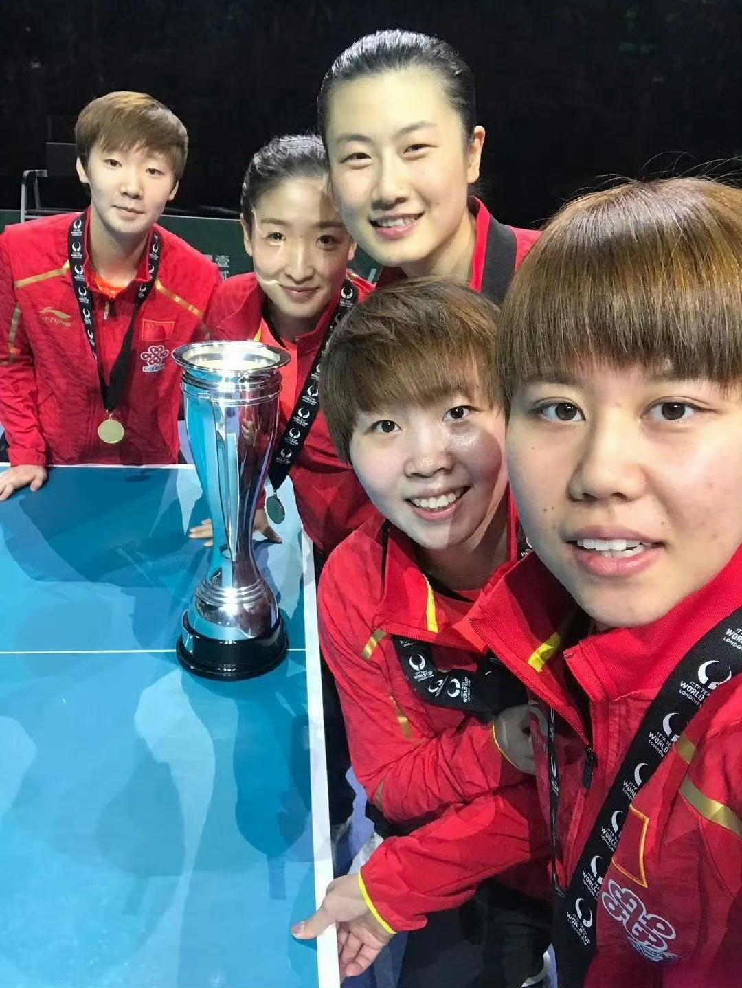 王曼昱第一个世界杯冠军, 那时候还不满19岁, 7选2中脱颖而出。 2018伦敦世界杯团体, 她为自己争取到了职业生涯第一个世界大赛的参赛资格, 团队非常给力, 每一个人实力雄厚, 在大家齐心合力之下, 勇夺冠军。 赛后大家一起开心合影, 那时候陈幸同是短发, 王曼昱还是瘦瘦的, 如今也是瘦瘦的。 比起以前, 她的世界排名来到了第二, 取得了更多的荣誉。