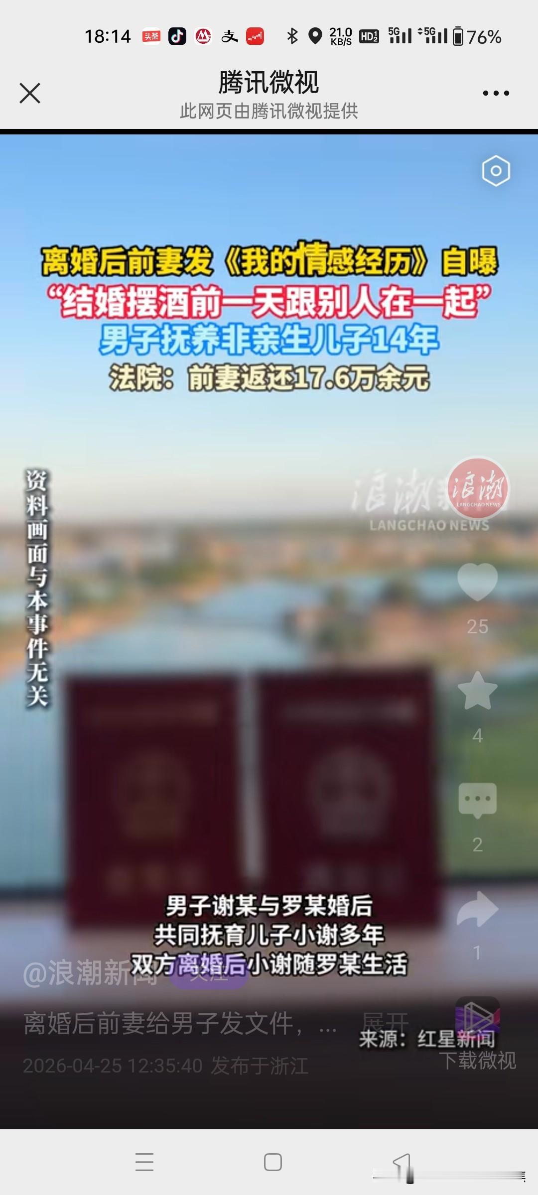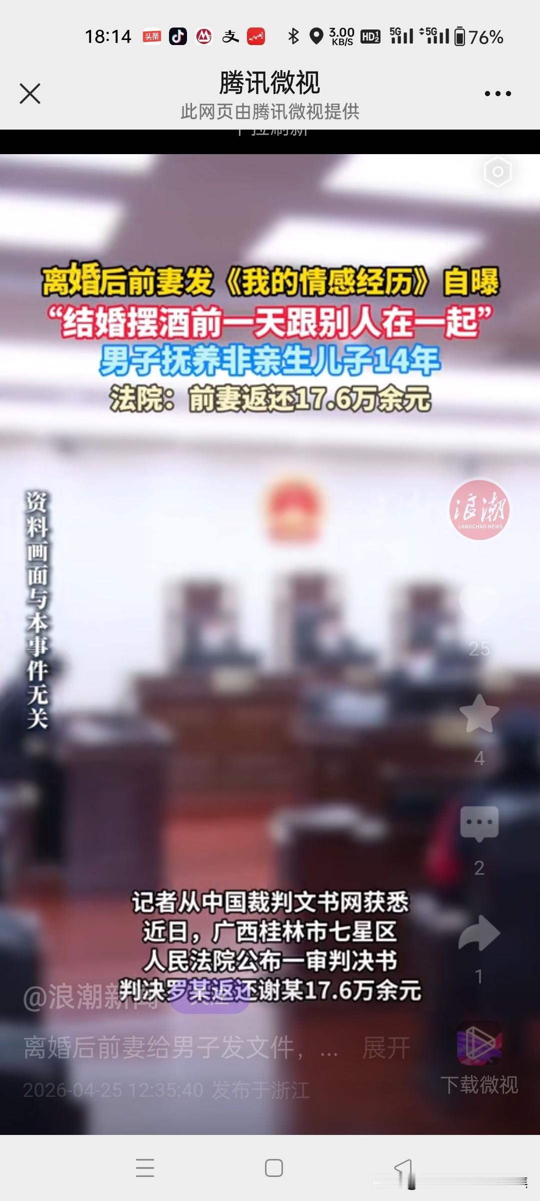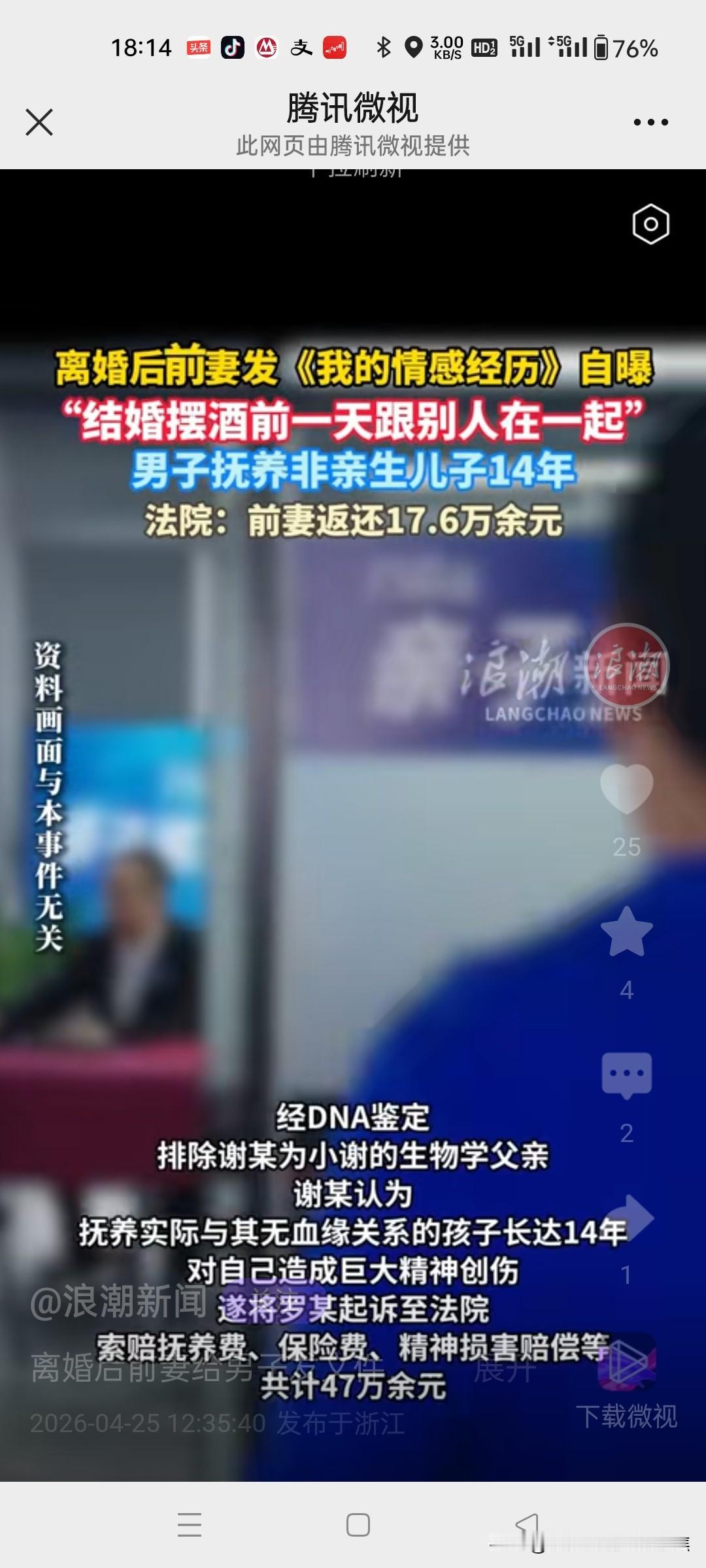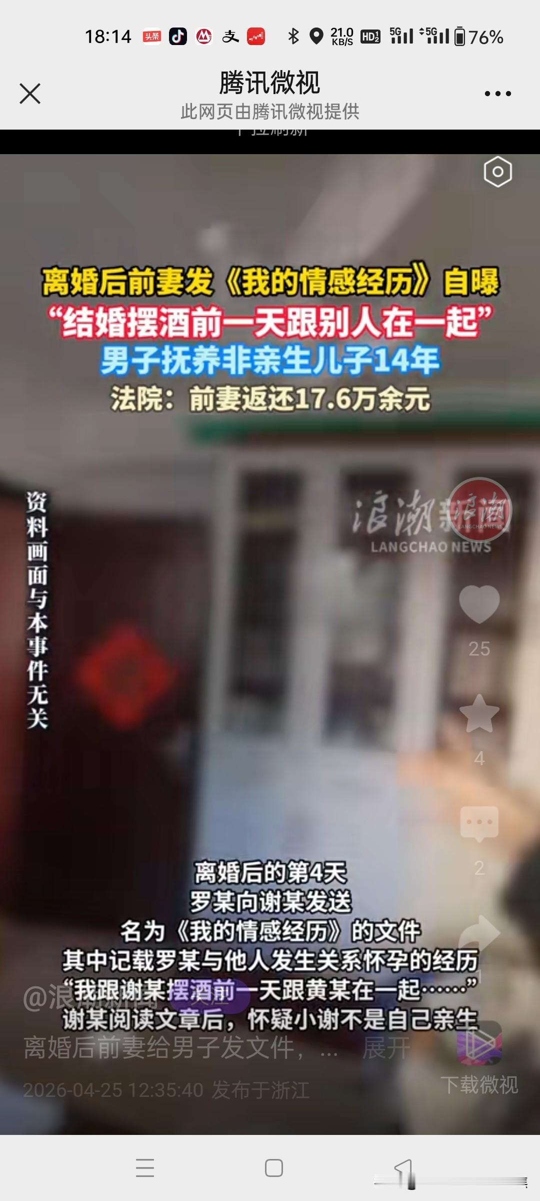网友评论,杀人诛心。离婚后前妻给男子发文件,称和别人发生关系,结婚前一天跟别人在一起,DNA鉴定孩子非亲生法院判决 法院判决前妻赔偿男子17.6万余元,包括返还抚养费、保险费及精神损害赔偿等。 广西桂林男子谢某与前妻罗某婚后共同抚养儿子小谢多年,双方于2024年5月20日登记离婚,孩子随罗某生活。离婚第4天,罗某通过微信向谢某发送名为《我的情感经历》的文件,自述在“结婚摆酒前一天与他人(黄某)发生关系”,并提及孩子可能非谢某亲生。 谢某随即委托司法鉴定中心进行DNA鉴定,结果显示排除其为小谢的生物学父亲。谢某认为自己遭受欺诈性抚养长达14年,精神受到严重伤害,遂起诉索赔抚养费、保险费、精神损害赔偿等共计47万余元。 法院审理认为,罗某在婚姻关系存续期间生育非谢某亲生子女,且长期隐瞒事实,严重违背夫妻忠实义务,构成重大过错。根据《民法典》相关规定,谢某作为无过错方有权请求损害赔偿。 最终,广西桂林市七星区人民法院一审判决: 返还抚养费124,800元(按每月1600元标准,双方各半承担,共156个月) 返还保险费29,550元(夫妻共同财产支付的十年分红型保险费用的一半) 精神损害赔偿金20,000元 鉴定费2,000元 以上合计17.6万余元。 值得注意的是,此类案件若缺乏直接证据或子女拒绝配合鉴定,法院通常无法推定亲子关系不存在。本案中谢某能成功维权,关键在于前妻主动提供书面自认材料,形成有力证据链。 两子非亲生案 丈夫和前妻 两儿非亲生案
