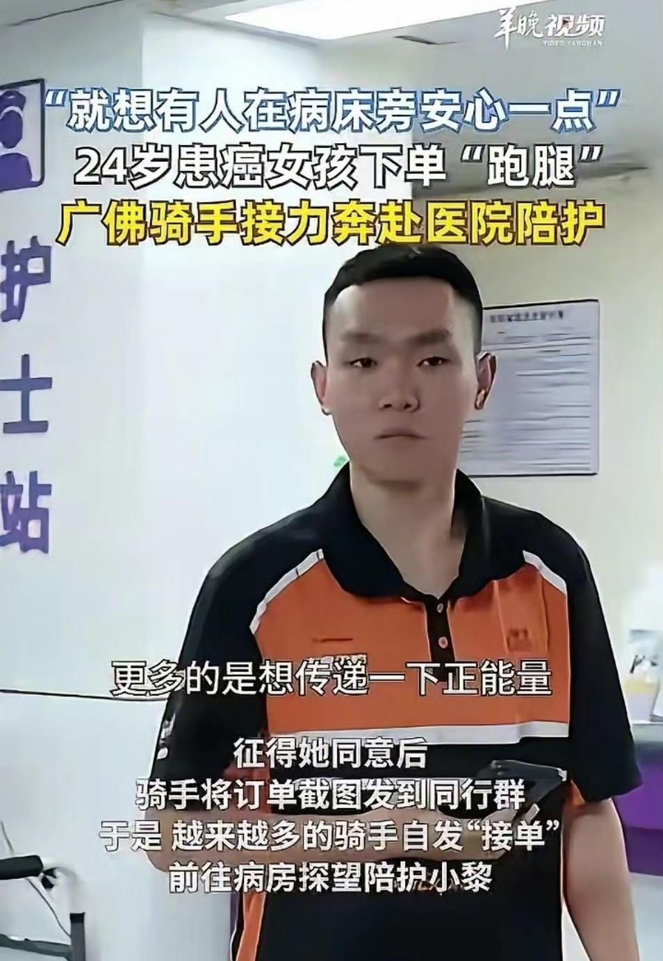 广东佛山的一间普通病房,因为一张特殊的跑腿单,成了最近全网最让人破防的地方。没有惊天动地的壮举,没有刻意煽情的剧本,只是一群为生计奔波的外卖骑手,和一个独自抗癌的异乡姑娘,用最朴素的举动,让我们看清了人间最珍贵的善意,从来都藏在底层普通人的互相搀扶里。 24岁的湖南姑娘小黎,孤身一人在佛山打工,本该是肆意绽放的年纪,却被确诊鼻咽癌。 家里父母务农、老人多病,她不想成为家人的负担,硬生生瞒着所有人,独自扛下一次次化疗的痛苦,独自面对医院里的冰冷与孤独。做增强CT必须有人陪同签字,化疗后的恐惧和无助压得她喘不过气,走投无路之下,她点开外卖软件,下了一单这辈子最特殊的订单:不用取送任何东西,只要有人来病床边陪她两个小时,让她能安心一点。 很难想象,这个姑娘在按下下单键时,心里有多绝望。她抱着一丝渺茫的希望,甚至做好了无人接单的准备,毕竟在这个快节奏的城市里,大家都忙着赚钱谋生,谁会愿意花两小时,去陪一个素不相识的陌生人?可偏偏,骑手董师傅接下了这单。 董师傅在佛山跑了三年外卖,见过形形色色的跑腿需求,唯独这一单,让他心里打鼓。是恶作剧,还是真的有人走投无路?不过几秒钟的犹豫,他还是选择奔赴医院。推开病房门的那一刻,眼前的场景让他心头一紧:孤零零的病床上,躺着面色惨白、瘦骨嶙峋的姑娘,眼神里满是慌乱和期待。 听完小黎的遭遇,这个在外打拼多年、见惯了生活艰辛的中年男人,心里又酸又堵。他自己也是异乡打工人,太懂一个人在陌生城市,生病无助时连个依靠都没有的滋味。原本承诺的两小时陪伴,他直接跟站点请假,陪了整整一下午。 跑前跑后帮忙打水买饭、陪同做检查、办理各种手续,空闲时就讲跑单遇到的趣事,想方设法分散她的注意力,不让她沉浸在病痛的绝望里。 临走时,小黎握着他的手不停道谢,说这是确诊以来最踏实的半天。董师傅心里不是滋味,留下一句承诺:有事随时找我,路过医院一定来看你。他本想只是在骑手群里说一声,让同行们多留意关照这个姑娘,没想到,这一句话,点燃了一场跨越广佛两地的爱心接力。 这群外卖骑手,都是从五湖四海来到珠三角打拼的普通人,每天风里来雨里去,为了几单配送费争分夺秒,迟到一秒可能面临投诉扣款,辛苦奔波只为养家糊口。可看到小黎的遭遇,没有人犹豫,没有人计较得失,纷纷主动站出来接力陪护。 有人腾出早班空闲时间陪她做检查,有人收工后特意带热饭热菜,有人自掏腰包买营养品送到病房,更有广州的骑手,每天跨城骑车赶来,就为给她端一碗家乡的湖南米粉,陪她说几句家乡话。 没有谁组织,没有谁要求,全是自发的善意。他们放下了手中的订单,放慢了奔波的脚步,把一个陌生的姑娘,当成了自己的亲妹妹。空荡荡的病房,从此再也没有冷清过,总有穿着骑手服的大哥,坐在床边轻声聊天、帮忙跑腿,用最笨拙的方式,给她对抗病魔的勇气。 我们总说,成年人的世界各有各的苦,大家都自顾不暇,哪有多余的精力去管别人的闲事。可这群骑手,用行动推翻了这个说法。 自己的生活本就不易,每天被生活压得喘不过气,却依旧愿意掏出心底的温柔,去温暖另一个深陷绝境的陌生人。有丰厚的收入,没有耀眼的身份,只是城市里最平凡的打工人,却在别人最无助的时候,毫不犹豫地伸出援手,这份不掺任何功利的善意,远比任何锦上添花都更动人。 小黎说,她从没想过,一次随手的下单,能换来这么多陌生人的真心。原本以为要独自熬过所有黑暗,是这些骑着电动车奔波的普通人,像一束束光,照进了她冰冷的病房,让她有了撑下去的勇气。后来事情被报道,网友、医院纷纷伸出援手,老家父母赶来,对着这群骑手含泪鞠躬,感谢他们替自己守护了女儿。 这件事之所以戳中无数人,是因为它足够真实,足够贴近每个普通人的生活。我们都曾是独自打拼的异乡人,都尝过无人依靠的滋味,所以更懂这份陌生人之间的惺惺相惜有多难得。 总有人觉得当下人心冷漠,可事实上,人间的暖意从未消失。它就藏在底层人不计回报的帮扶里,藏在普通人举手投足的善良里。这些奔波在城市里的骑手,自己满身泥泞,却依旧想着为别人撑伞,用最朴素的行动,诠释了人性本真的温柔。 世间最难得的从不是惊天动地的善举,而是陌生人之间不图名利的真心相待。这群平凡的打工人,用一次简单的奔赴,一场自发的接力,点亮了异乡姑娘的抗癌路,也让我们看到,普通人互相照亮的力量,足以驱散所有的黑暗与寒凉。