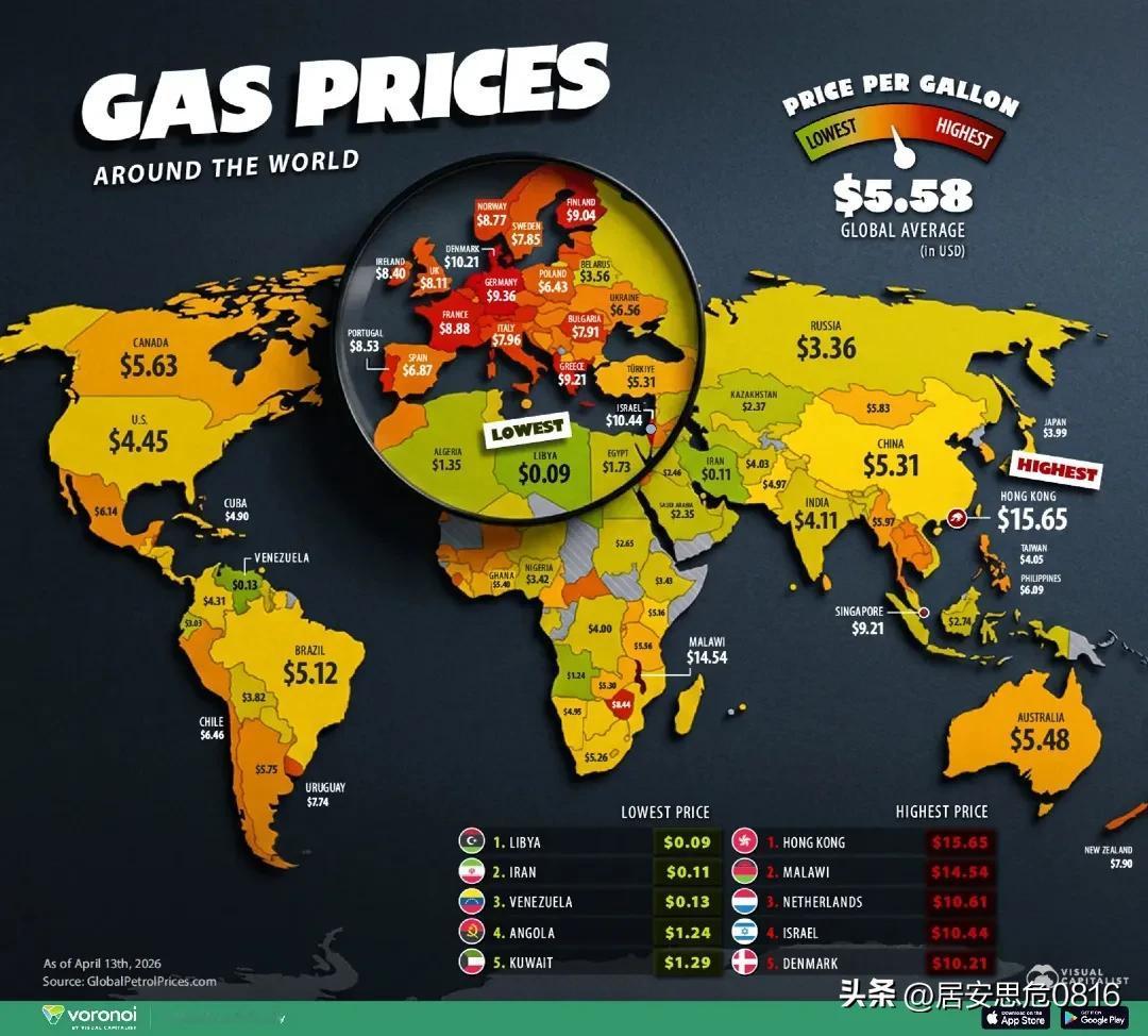 🇮🇷🇺🇸 伊朗战争正在推高原油价格,但世界各国每加仑汽油的价格存在惊人的差异。 利比亚:0.09美元 伊朗:0.11美元 委内瑞拉:0.13美元 安哥拉:1.24美元 科威特:1.29美元 阿尔及利亚:1.35美元 埃及:1.73美元 卡塔尔:1.73美元 沙特阿拉伯:2.35美元 哈萨克斯坦:2.37美元 阿拉伯联合酋长国:2.46美元 印度尼西亚:2.74美元 白俄罗斯:3.56美元 俄罗斯:3.36美元 埃塞俄比亚:3.48美元 尼日利亚:3.42美元 日本:3.99美元 苏丹:4.00美元 伊拉克:4.03美元 台湾:4.05美元 印度:4.11美元 美利坚合众国:4.45美元 古巴:4.90美元 加纳:5.40美元 中国:5.31美元 土耳其:5.31美元 肯尼亚:5.30美元 巴西:5.12美元 澳大利亚:5.48美元 加拿大:5.63美元 墨西哥:6.14美元 波兰:6.43美元 智利:6.46美元 菲律宾:6.09美元 西班牙:6.87美元 乌克兰:6.56美元 阿根廷:5.75美元 乌拉圭:7.74美元 瑞典:7.85美元 意大利:7.96美元 英国:8.11美元 爱尔兰:8.40美元 葡萄牙:8.53美元 挪威:8.77美元 法国:8.88美元 芬兰:9.04美元 希腊:9.21美元 新加坡:9.21美元 德国:9.36美元 丹麦:10.21美元 以色列:10.44美元 荷兰:10.61美元 马拉维:14.54美元 香港:15.65美元
