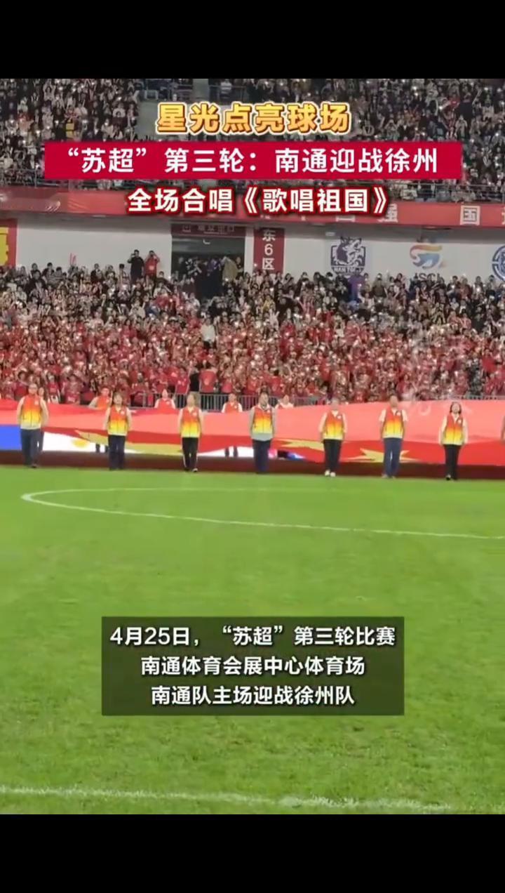 星光点亮球场,"苏超"第三轮:南通迎战徐州,全场合唱《歌唱祖国》。 扬子晚报/紫牛新闻见习记者戎毅晔编辑周嘉楠。 4月25日,"苏超"第三轮比赛南通体育会展中心体育场南通队主场迎战徐州队。"苏超"第三轮比赛《歌唱祖国》再次响彻球场,全场球迷点亮点点星光共同合唱。 2026江苏省城市足球联赛。