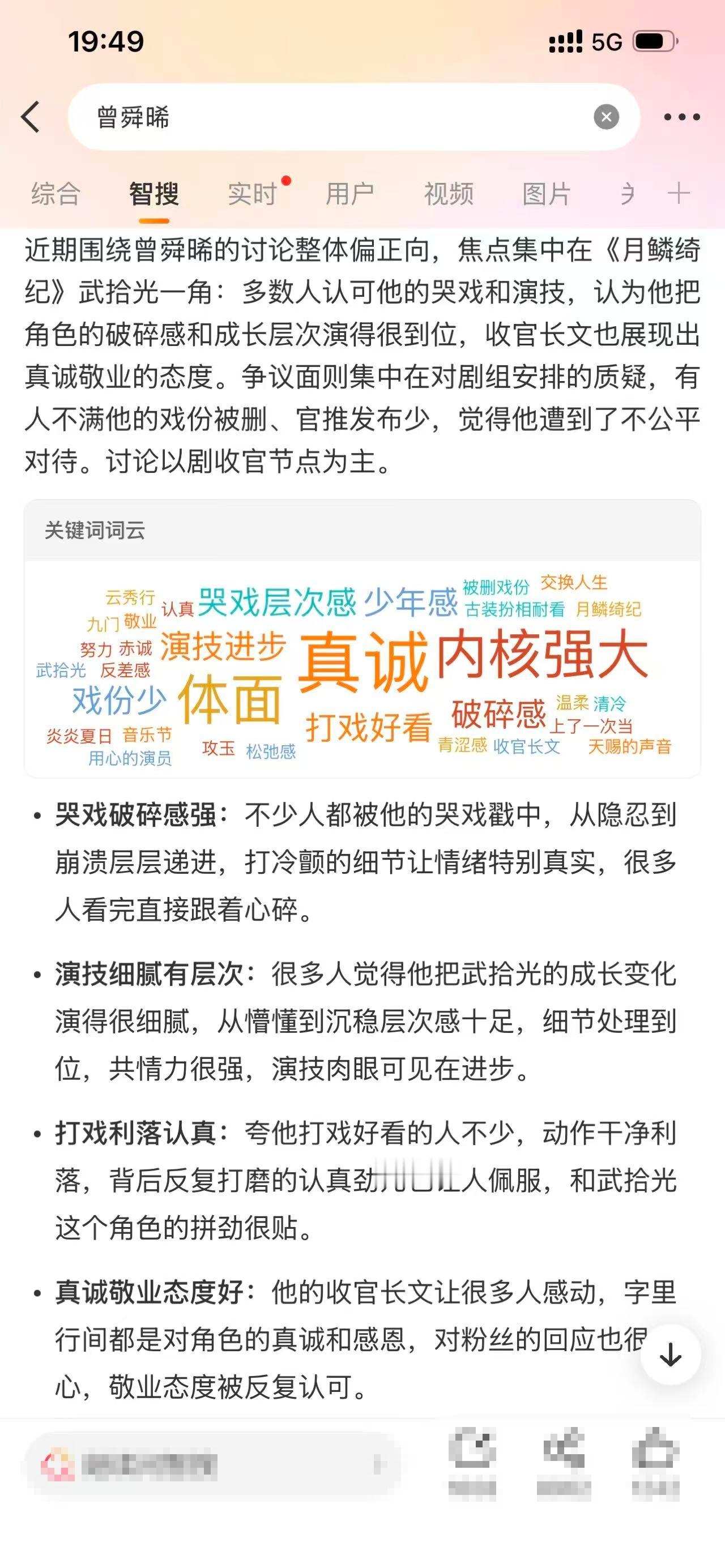智搜里的曾舜晞智搜给曾舜晞的关键词 翻完智搜里关于曾舜晞的讨论,真的能感受到大家对曾舜晞的满满认可。大家也都清晰看到了他演技的肉眼可见进步,把角色每一个阶段的层次感都演得细腻又有共情力,连打戏都干净利落、动作流畅。对观众和粉丝的回应也满是用心,这样认真对待角色、真诚对待观众的演员,他的努力和闪光点都被大家牢牢记住了。(cr:网络)曾舜晞
