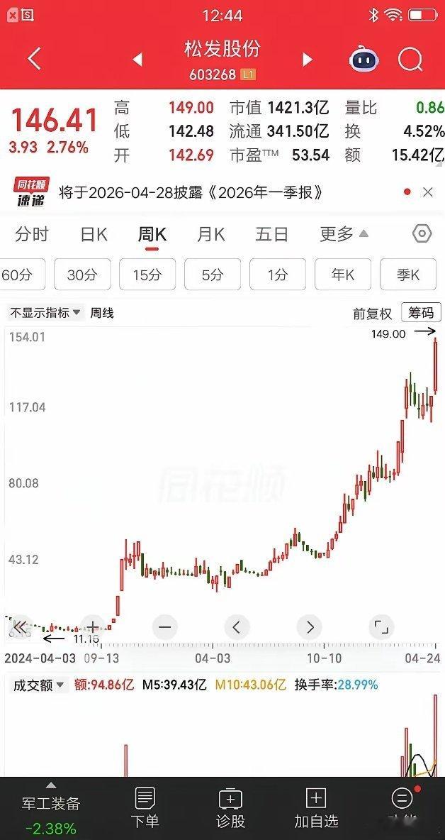 非常牛掰,从戴帽到摘帽只用了一年时间。股价从11元涨到149元,不到两年的时间涨超12倍。这在大A历史上也是少见的,到底发生了什么?2025年4月29号,公司因业绩不达标,被特别处理改名为*ST松发。后来经过重大资产重组,公司完成了战略转型。2025年营收216.39亿增长274.95%。净利润26.55亿增长1083.05%。在今年4月20号成功摘帽,改名为松发股份。股价周线图显示,从11.16元一路涨到149元,周五刚创历史新高,取得了超过12倍的涨幅。公司置入恒力重工100%股权,转型为船舶及高端装备制造,超大型原油运输船全球第一。在美伊关系紧张的影响下,受到资金关注。大家别误会,并非让大家去买,反而要提示风险,因为股价涨的太高了。