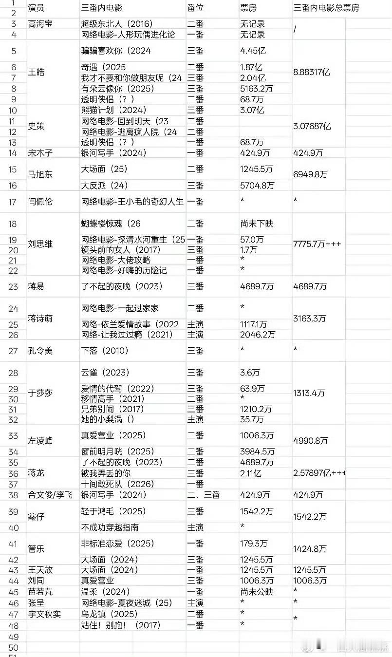 看了一圈才发现,很多原本不太熟的名字,其实也已经演了不少剧和电影了,这份表如果把电视剧成绩也一起算上,参考价值可能会更完整一些。这样看下来,王皓和史策在搭档出圈之后,整体实绩确实算是最好的;而凭《少爷和我》走红的张哲华也还不错,虽然电影这边不算特别突出,但电视剧资源确实是相当可以。
