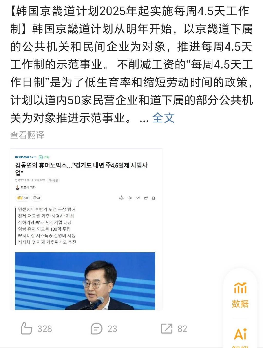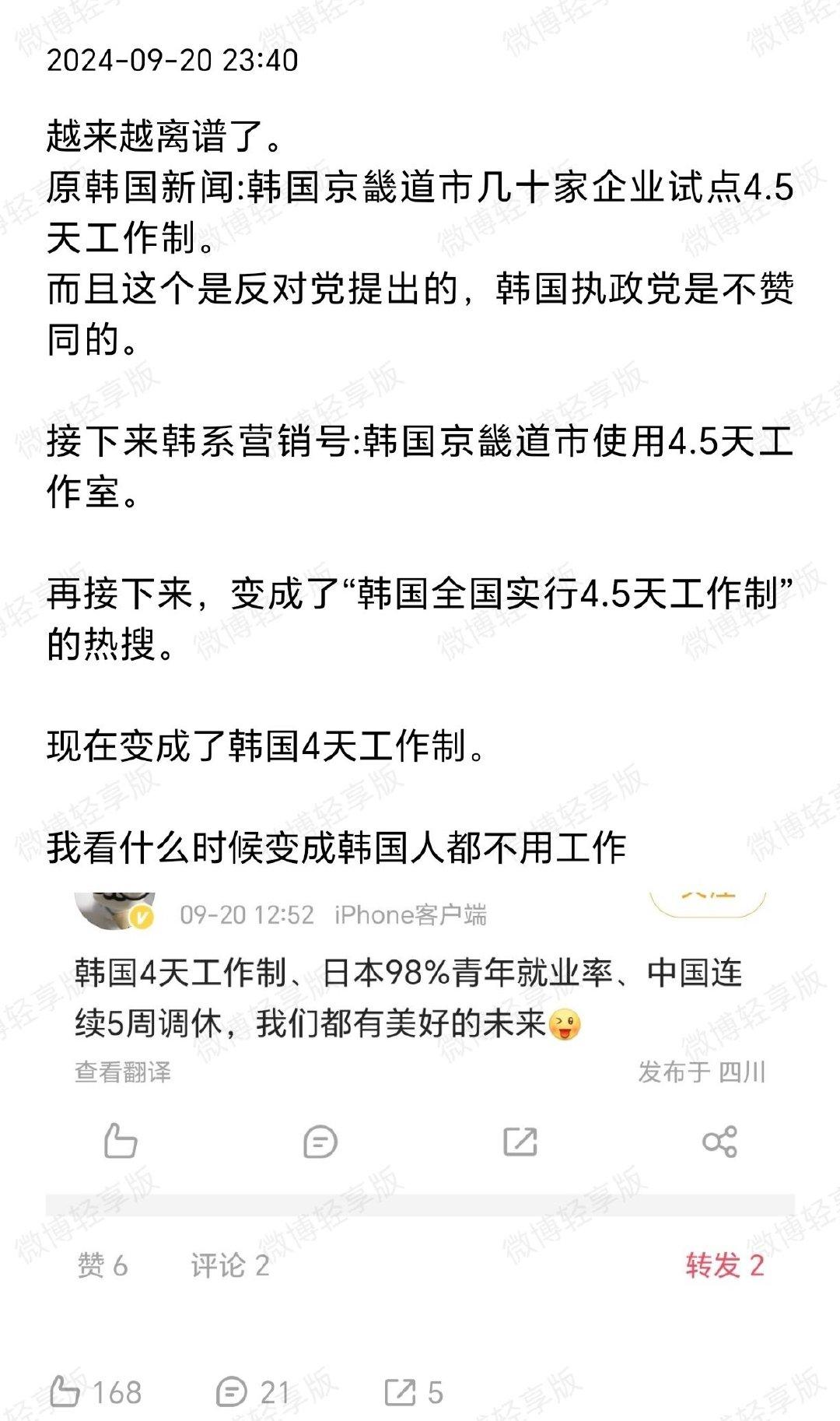 我真的服了,现在还在造谣韩国工作日四天? 告诉你们这个谣言是怎么演变的, 2023年原韩国新闻:韩国京畿道市几十家企业试点4.5天工作制。而且甚至京畿道都不是全部4.5工作制。 接下来韩系营销号:韩国京畿道市使用4.5天工作工作制再接下来,变成了“韩国全国实行4.5天工作制”,现在在你们嘴里变成了韩国4天工作制。我看什么时候变成韩国人都不用工作