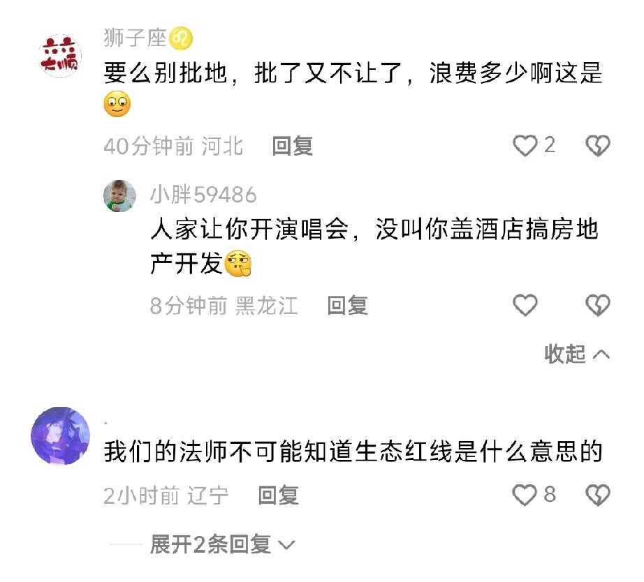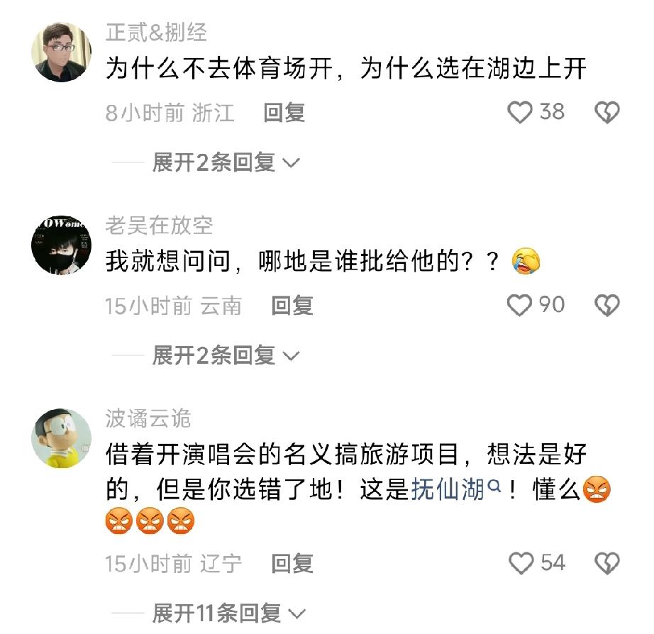华晨宇抚仙湖演唱会取消,粉丝:谁批的地 原来他选的地方是一级饮用水源地,而且华晨宇不仅打算开演唱会,还有吃喝玩乐等项目。 这样一来极有可能造成污染,演唱会被取消也是可以理解的。 粉丝心疼华晨宇的前期投入,建好了又拆,问谁批的地?批了干嘛又取消? 网友评论: 批地的没问题,但是用地的不能破坏环境。 人家让你开演唱会,没叫你盖酒店搞房地产开发[抠鼻] 华晨宇抚仙湖