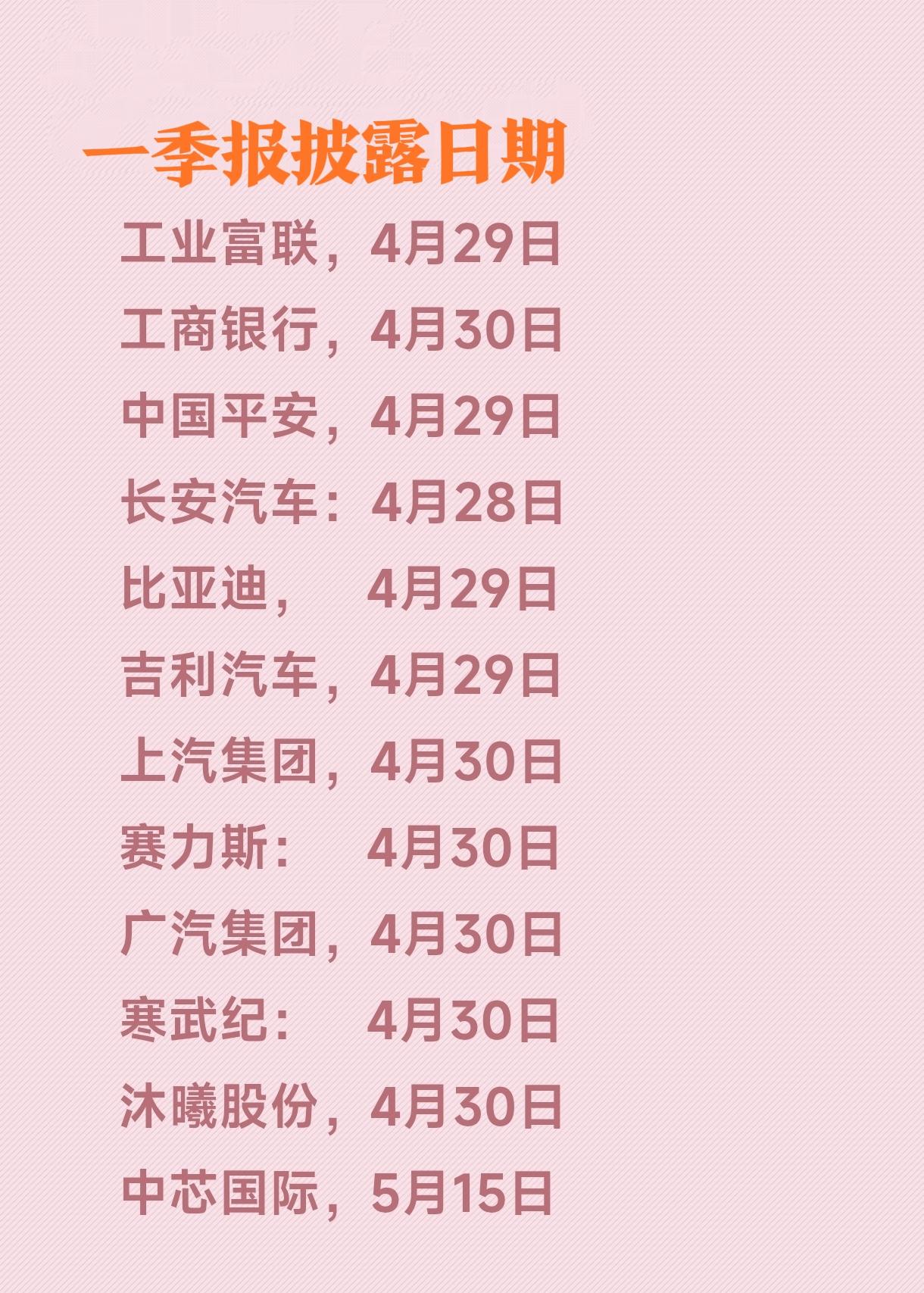 工业富联、比亚迪、吉利汽车、中国平安等公司将于4月29日披露一季度业绩。工商银行、上汽集团、寒武纪等公司4月30日披露一季度业绩。 一批热点公司一季度业绩披露时间确定了,包括比亚迪、工业富联、工商银行、寒武纪、中芯国际等公司,业绩披露日期如下: 工业富联,4月29日 工商银行,4月30日 中国平安,4月29日 长安汽车:4月28日 比亚迪, 4月29日 吉利汽车,4月29日 上汽集团,4月30日 赛力斯: 4月30日 广汽集团,4月30日 寒武纪: 4月30日 沐曦股份,4月30日 中芯国际,5月15日 值得说明的是,在业绩披露日前一天,我们就能在网络上看到相关数据了。 长城汽车,已经披露,净利润9.46亿元,同比下降46%; 中际旭创,已经披露,净利润57.35亿元,同比增长262%; 中国移动,已经披露,净利润293.4亿元,同比下降4.2%今日A股
