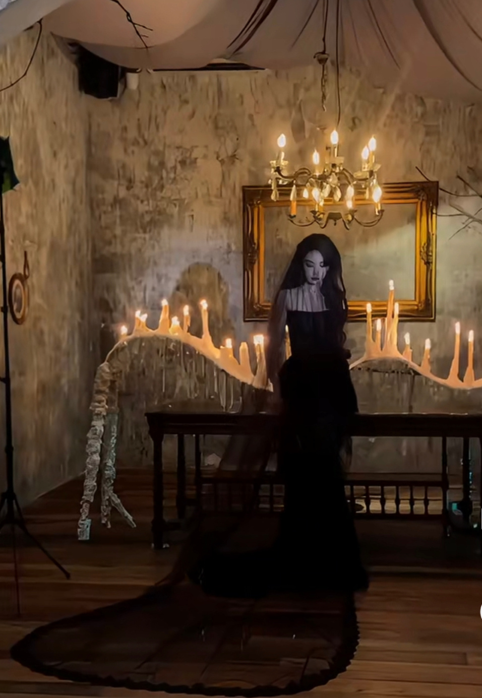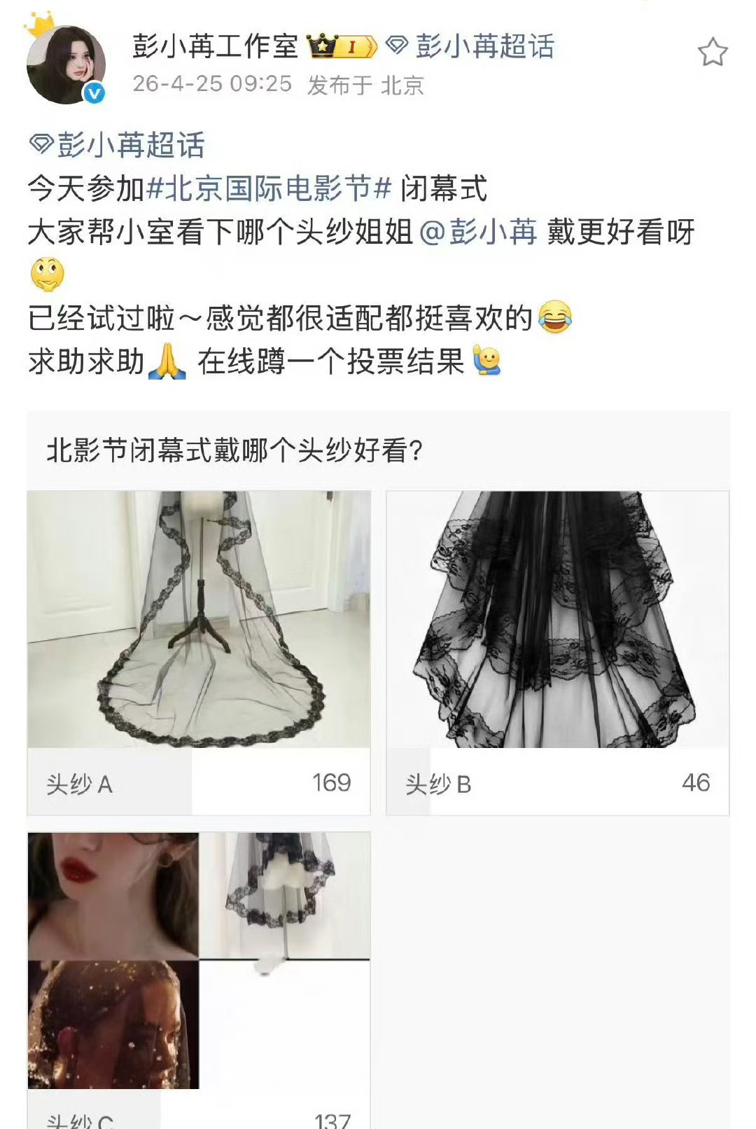 彭小苒也太有诚意了!听从网友投票选择佩戴黑色头纱亮相北影节红毯,清冷黑纱搭配精致礼服,真的美得像油画一样