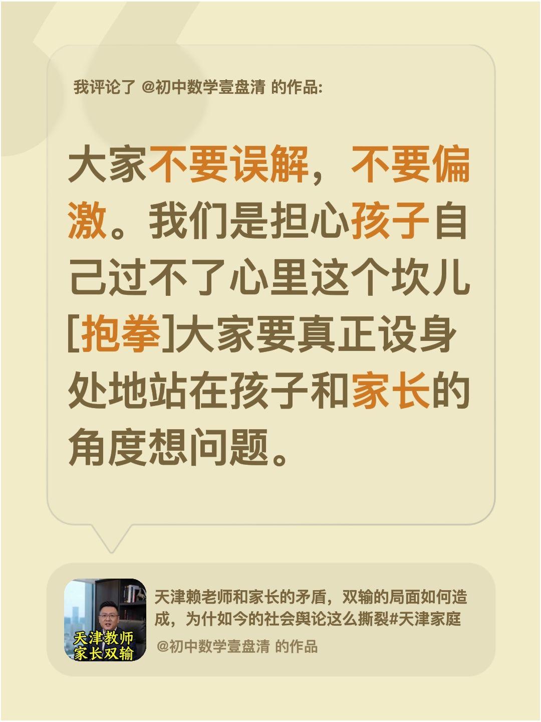 大家不要误解这个所谓的双输……我评论了@初中数学壹盘清 的作品: 大家不要误解,不要偏激。我们是担心孩子自己过不了心里这个坎儿[碰拳]大家要真正设身处地站在孩子和家长的角度想问题。