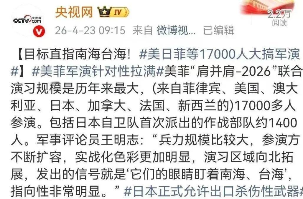 菲外长颠倒黑白,喊话中国 4月24日,菲律宾吕宋岛附近海域气氛高度紧张——美国、菲律宾、日本等多国1.7万大军正联合举行“肩并肩”演习。 这不是普通的军事秀场,演练科目直接点破主题:海上联合、两栖作战、夺岛,还有实打实的反导、反舰操作。 美国士兵多达万人,菲律宾7000,甚至连日本、澳大利亚、法国都来凑热闹,眼看这一支队伍已经成了声势浩大的“安全朋友圈”。 就在这样的背景下,菲律宾防长特奥多罗站到镜头前对中国喊话,要求加强武器、驻军部署,还宣称要提高拦截力,阻止所谓“侵犯专属经济区”的势力。 他话音刚落,身后沙滩夺岛演练打得火热,颇有一种借外力为自己壮胆的意味。 他还举起“国家安全”的大旗,声称菲律宾有权怎么布置自己的安全阵线,却把矛头指回中国,说中国一边批评,一边自己升级军力。 表面上硬气,实际上大家心知肚明。菲律宾的军事实力有限,这场大动作的联合军演,更像是“抱团取暖”:摆出强硬姿态,实则靠美国等盟友撑腰。 有专家分析,特奥多罗不断强调“受威胁”,却避而不谈菲律宾几十年来在南沙争议岛礁的非法存在,不少观点认为这是转移视线、倒打一耙。 有意思的是,这场声势浩大的军演,并没得到所有菲律宾人的支持。 能源危机、油价飙涨、比索贬值,已经让国内经济吃紧,有研究称今年菲律宾可能会新增百万人口陷入贫困。 在这样的压力下,大量资金流进军演、先进装备亮相,本国民众态度复杂——与其土豪式军演,不如优先改善民生。 更值得关注的是日本自卫队的出现,自二战后首次以作战身份进入菲律宾,勾起不少老一辈的苦痛记忆,战争创伤还未抚平,如今“旧友”带着军靴再次踏足,自然引发民众争议。美日插足,显然不单是“演习”那么简单。 中国方面反应直接,奉劝菲律宾不要再卖力演戏,双方争议不应靠外力堆砌,主动挑衅只会增加地区的不确定性。 如果继续一意孤行,即便外来“朋友”再多,最后砸脚的还是菲律宾自己。 本质上,这场演习和防长喊话都是老问题的新动向。 菲律宾希望通过外部结盟,对中方施压,在南海问题上抢占更多主动,但区域和平更需对话而非对抗。 毕竟一味选边站队,带来的往往是风险大于收益。