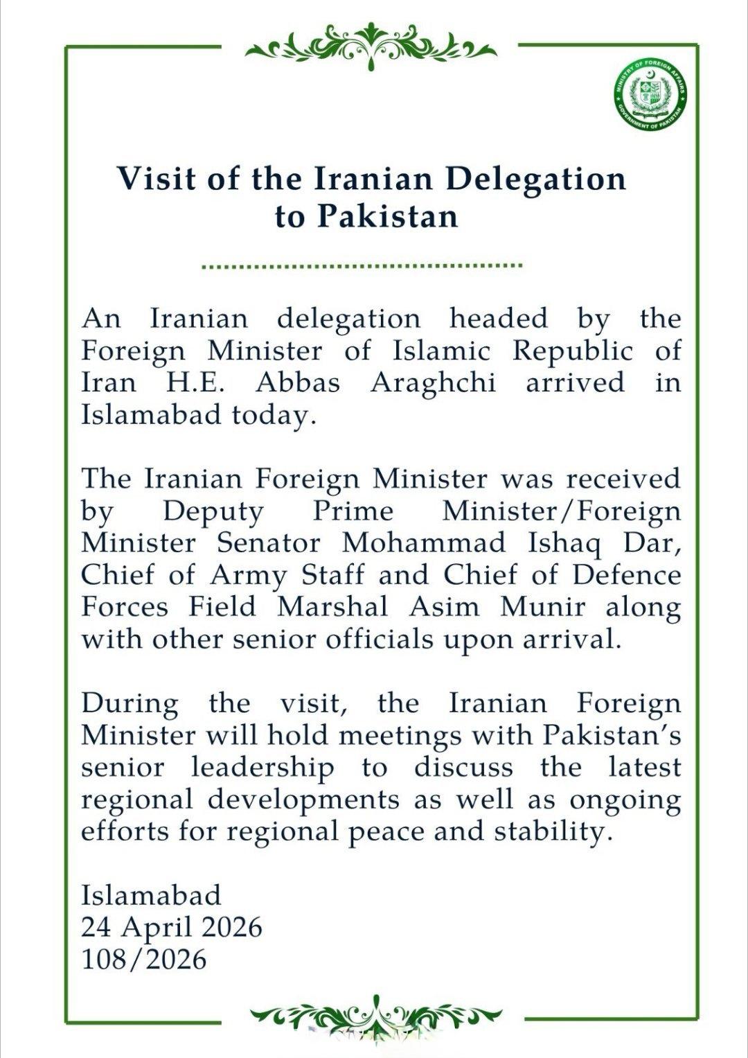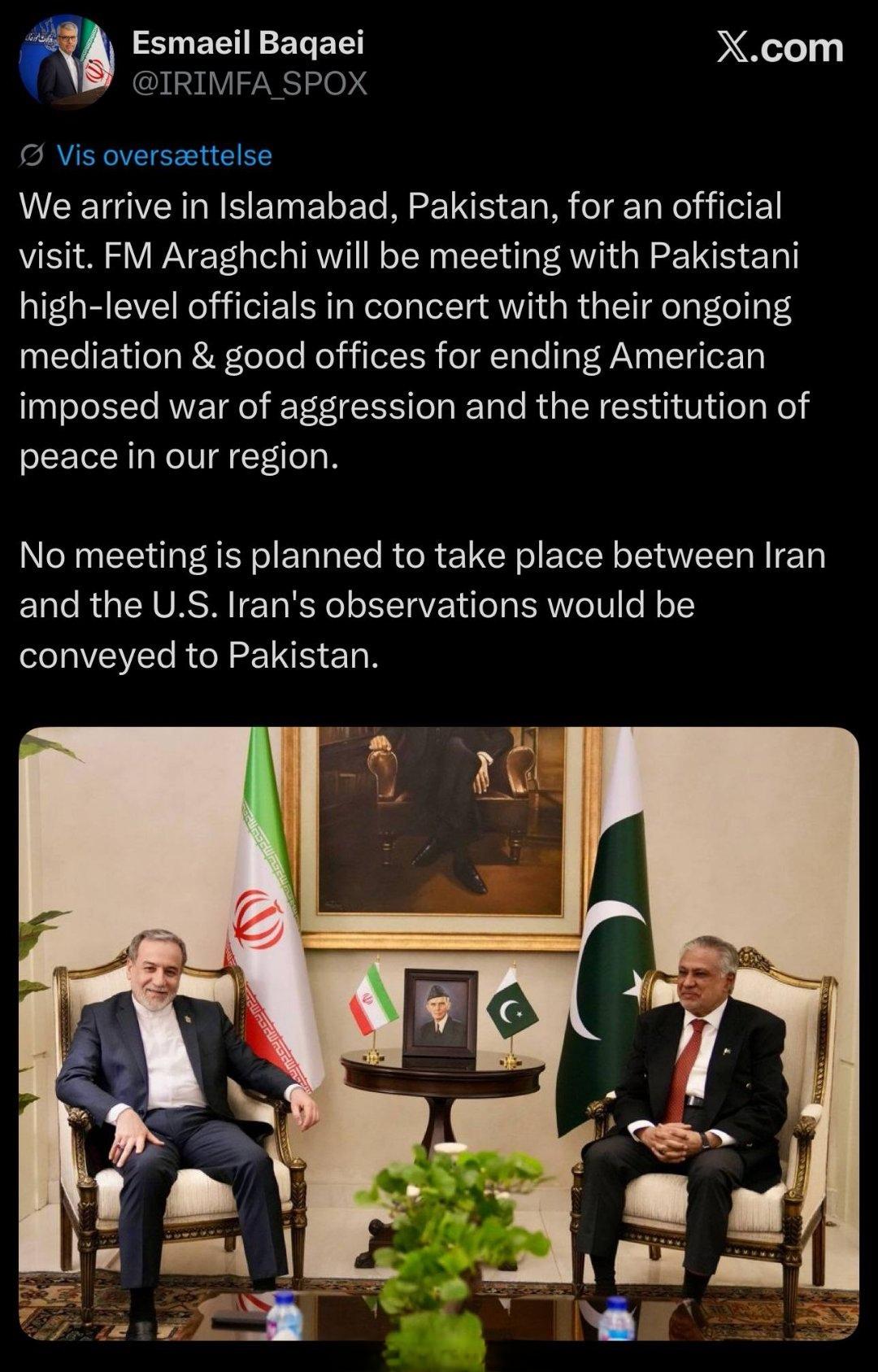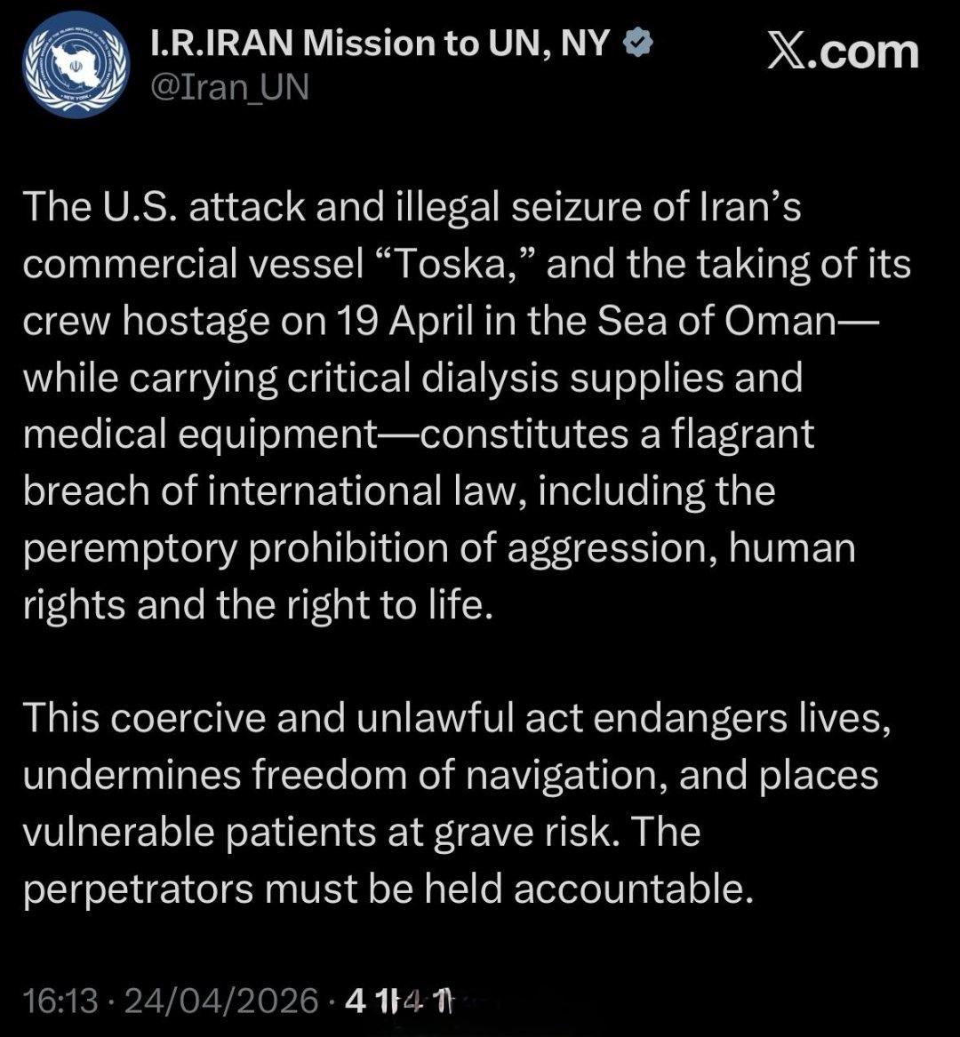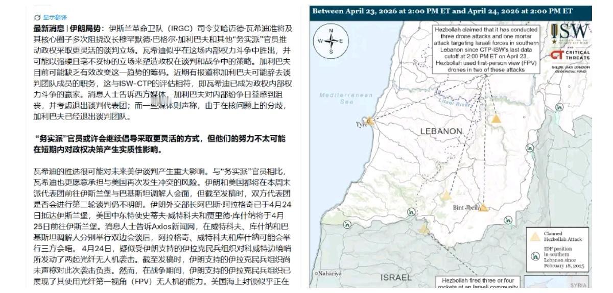 据革命卫队下属“拉贾新闻社”报道,伊朗最高领袖在当前条件下已“彻底禁止”与美国谈判。外长阿拉格齐将不会在巴基斯坦与库什纳及维特科夫会面。 而白宫几分钟前刚刚声称:“伊朗主动接洽,要求举行面对面会谈。” 伊朗外长阿拉格齐抵达巴基斯坦首都伊斯兰堡。 伊朗外交部发言人伊斯梅尔·巴盖伊在X网站上发帖证实,伊朗没有与美国官员举行会晤的计划。 伊朗外交部长阿巴斯·阿拉格奇将在伊斯兰堡会见巴基斯坦高级官员,并向他们递交一份书面文件,阐述伊朗对近期事态发展的看法。 伊朗外交部发言人巴盖伊: “我们(伊朗)抵达巴基斯坦首都伊斯兰堡进行正式访问。阿拉格奇外长将与巴基斯坦高级官员会面,配合他们正在进行的调解和斡旋工作,旨在结束美国发动的侵略战争,恢复我们地区的和平。目前没有安排伊朗与美国之间的会晤。伊朗的意见将通过巴基斯坦转达。” 伊朗驻联合国代表团表示,此前被美军扣押的伊朗船只TOSKA号载有民用医疗设备,这与美国政府对外宣称的不会扣押/阻止运输食品或医疗设备的船只的承诺相悖。此外伊朗革命卫队宣布扣押了一艘与美国军方有关的船只EPAMINODES号。 美国智库ISW称,伊斯兰革命卫队(IRGC)司令艾哈迈德·瓦希迪准将已经夺取伊朗军政实权。 伊朗议会国家安全委员会委员艾哈迈德·阿贾姆声明,伊朗绝不容许美国介入关乎其战略命脉的霍尔木兹海峡事务。 伊朗塔斯尼姆通讯社4月25日援引伊朗武装部队“哈塔姆·安比亚”中央总部发言人易卜拉欣·扎法拉里的话报道: 🔹如果美国军队继续在中东地区进行包围、海盗和海上抢劫,他们必将遭到伊朗强大武装力量的回击。 🔹美国应当知道,伊朗武装力量比以往任何时候都更具实力和准备,捍卫主权、领土和国家利益,美国军队在第三次强加战争(指美伊以战争)中已亲身感受过伊朗的部分实力和攻击能力。 🔹伊朗准备好并决心在监视敌人在中东地区的行为和动向、继续管理和控制霍尔木兹海峡。如果美国和以色列再次侵略,伊朗将对其造成更严重的损失。 今天伊朗外交部长阿巴斯·阿拉格奇在伊斯兰堡与巴基斯坦陆军参谋长阿西姆·穆尼尔举行了会晤。 伊朗记者在该国首都德黑兰的迈赫拉巴德国际机场拍摄到了该地点遭遇美以空袭后的结果。
