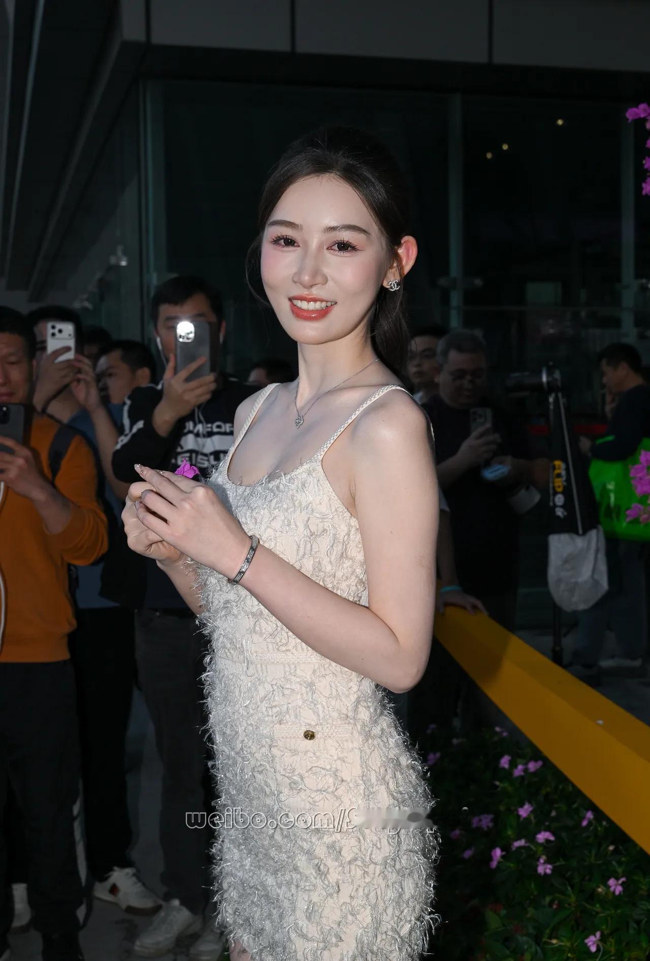 这姑娘穿着蕾丝吊带裙,温柔甜美。